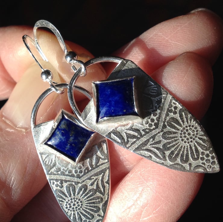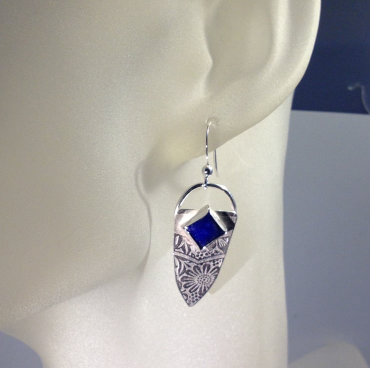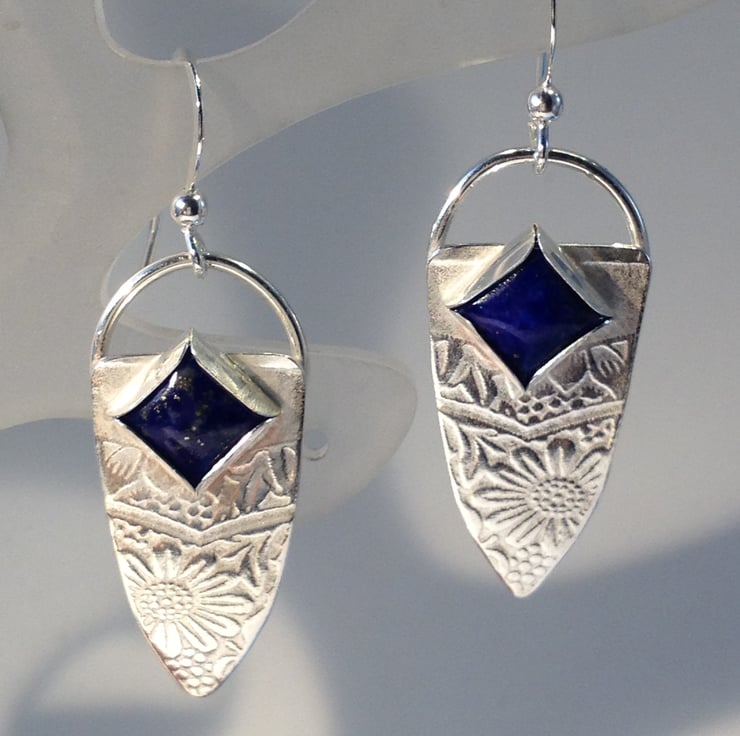 BeautifuL dark blue Lapis square cut stones set on embossed sterling silver shields with sterling ear wires. The earrings measure 45mm from the top of the ear wires. They will be nicely boxed and complete with soft earnuts for security during wear.