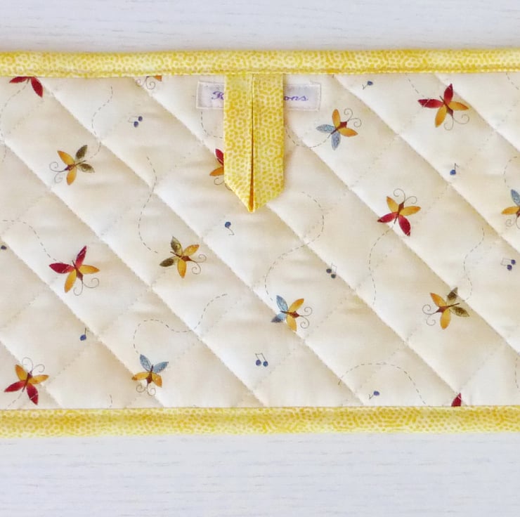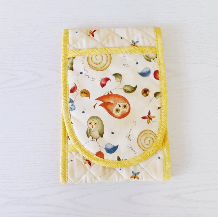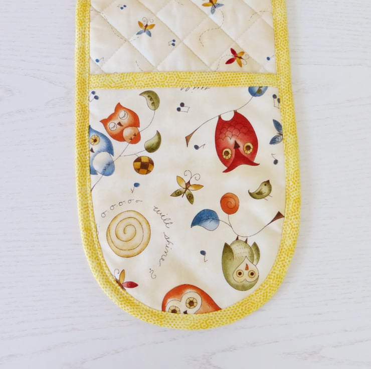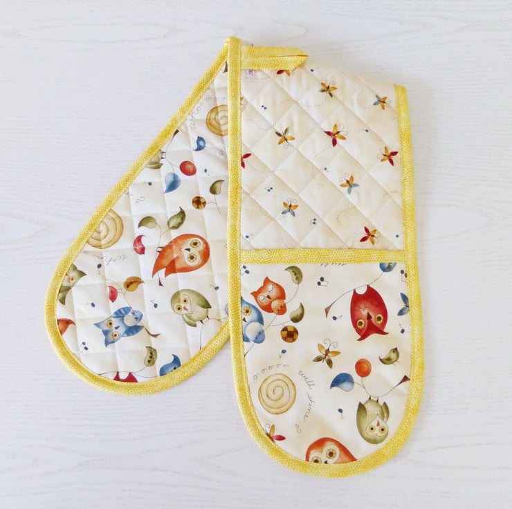 These oven gloves have been made using a lovely quilting cotton fabric with an owl design, and a matching cotton fabric with a small butterfly design. The background is a soft cream colour, the owls and butterflies are in subtle shades of red, green and blue.