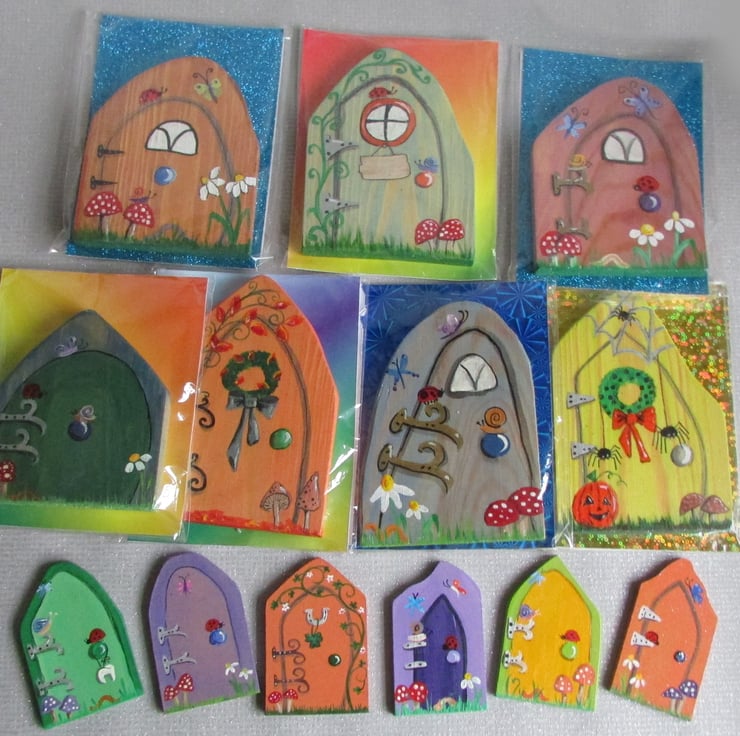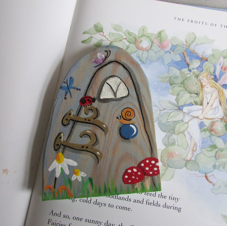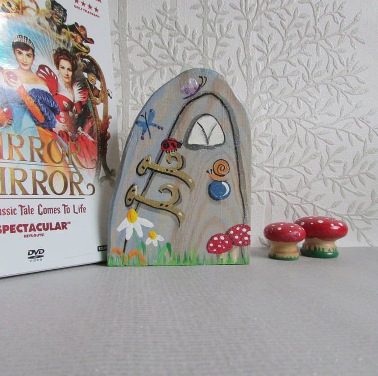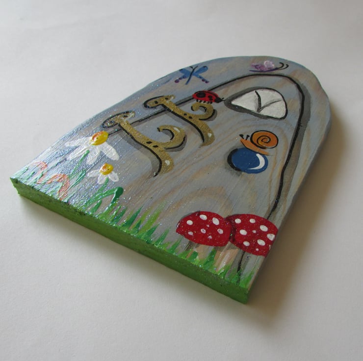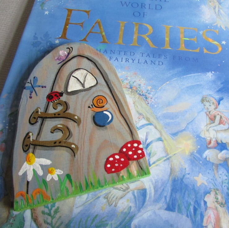 This is one of my Medium sized Wee Folk Doors,it is painted free hand so no two are ever the same. This is approx 4 x 5 inches. It comes with a sticky backed pad and look good above a door frame, on a skirting board or anywhere you want the wee folk to enter. It also comes with an attachment so it can be freestanding on a shelf.