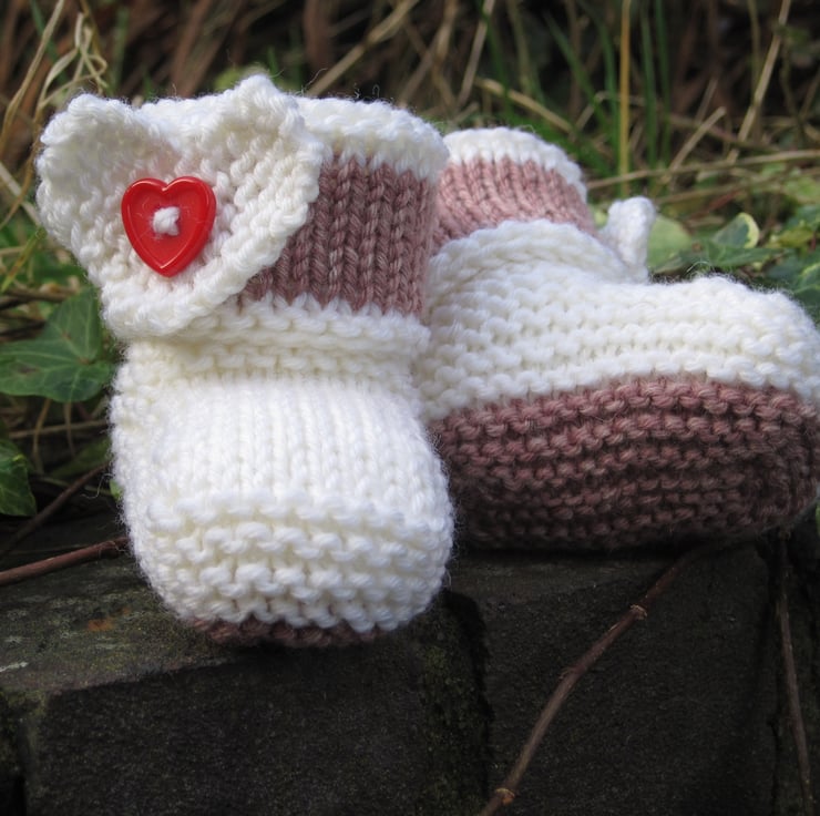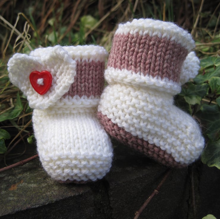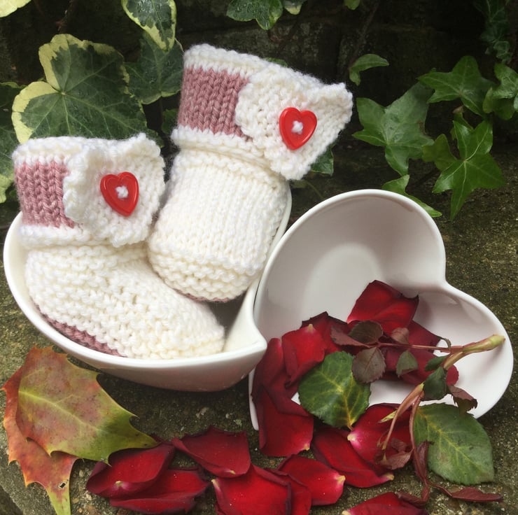 These cute booties knit up easily and quickly, so why not treat your little sweetheart to a pair! The heart buttons could be easily replaced by a simple cross stitch if you prefer.