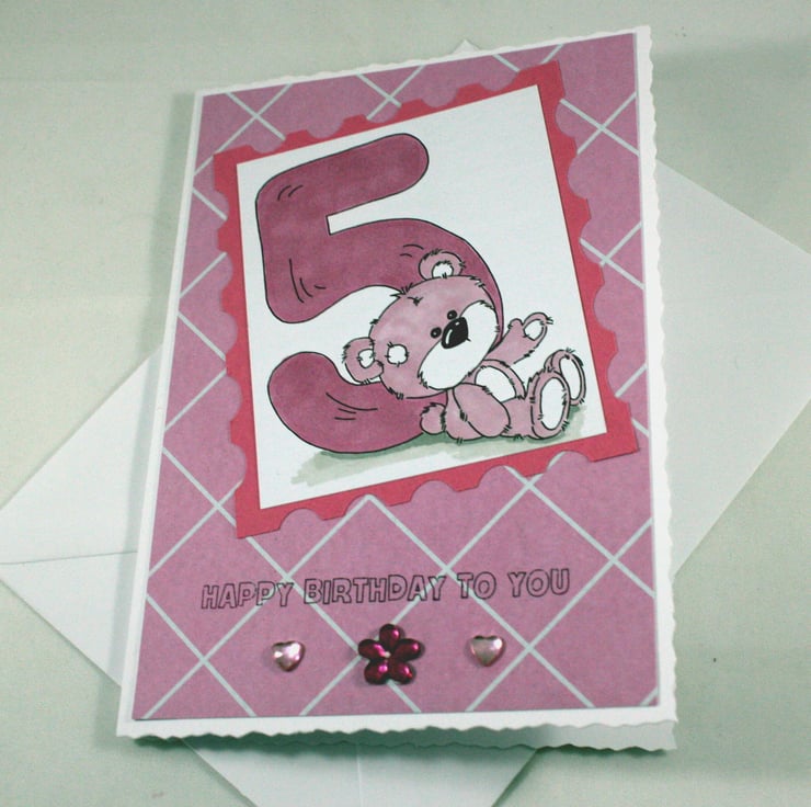 A6 sized birthday card featuring an image of a bear leaning against the number 5. The image has been hand coloured and mounted onto a piece of pink card cut in the style of a postage stamp. This has then been layered over pink checked background card with the message 'Happy Birthday to you'. The card is embellished with a pink flower gem and two pink hearts.