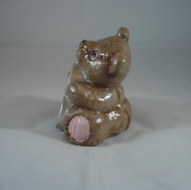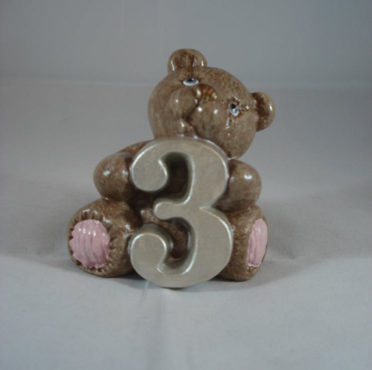 I have for sale a small ceramic animal ornament, which was hand painted by myself. It is a sitting brown bear figurine, holding a number three between its paws. This would be a fun and novel Birthday cake topper, or perhaps given as a gift.