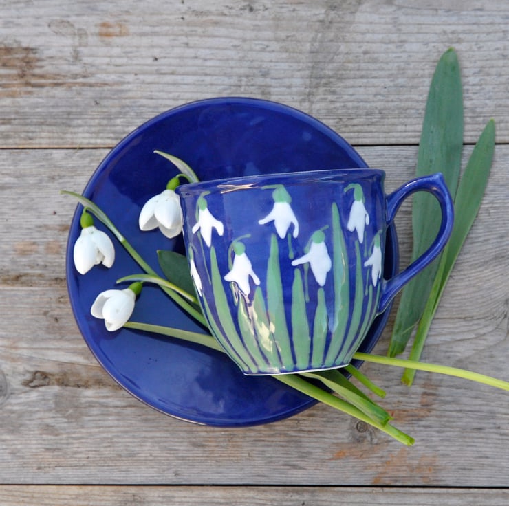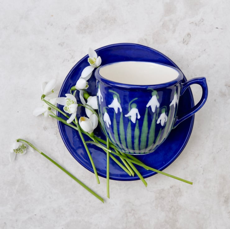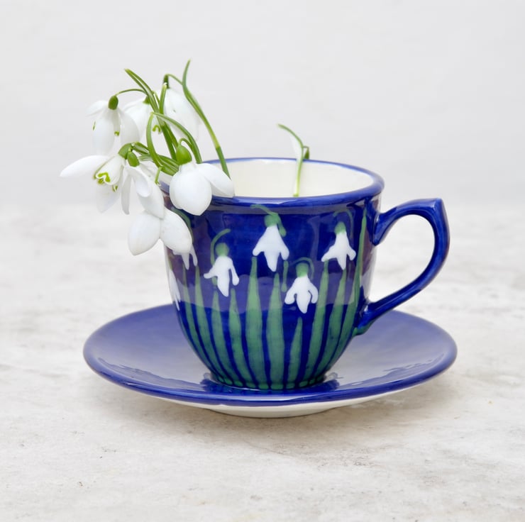 The Snowdrop Cup and Saucer design with its beautiful, dark blue background and its white snowdrop is both unusual and striking. It takes 6 coats of blue glaze to get that deep blue on the cup and saucer.