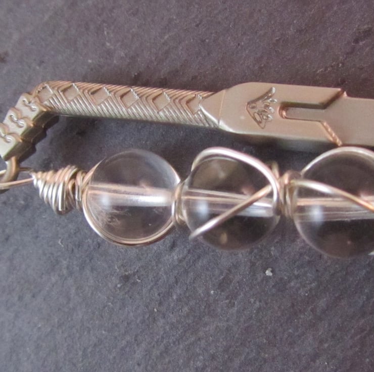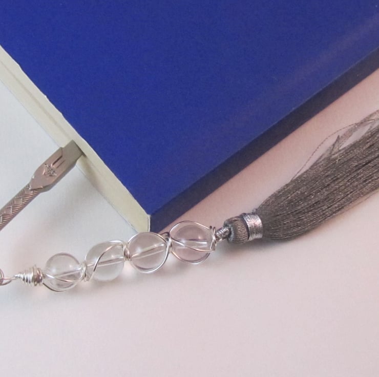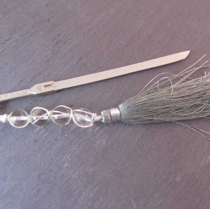 This is a stunning clear quartz wire wrapped sword bookmark. It is created with real clear quartz gemstones, silver plated copper wire, a tassel, and the sword is a zinc alloy. The ideal gift for those who love swords, katanas, swashbuckling, fantasy or anime. Or treat yourself.