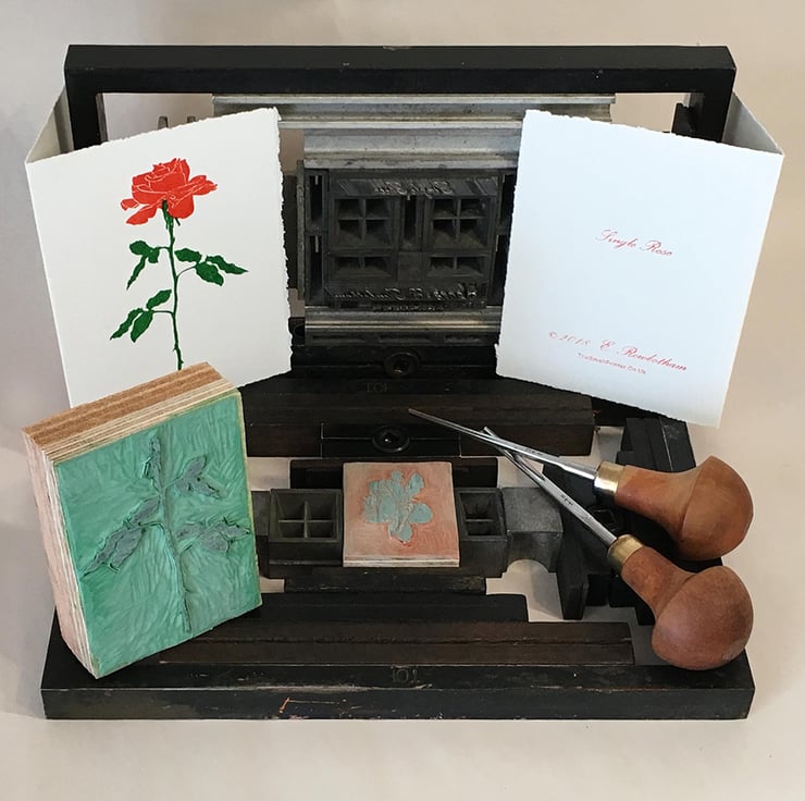 Hand-printed linocut Valentine's Card, Anniversary or Engagement Card or Notelet, with info on the back hand-set in old letterpress, hand inked & printed on my ancient Press.