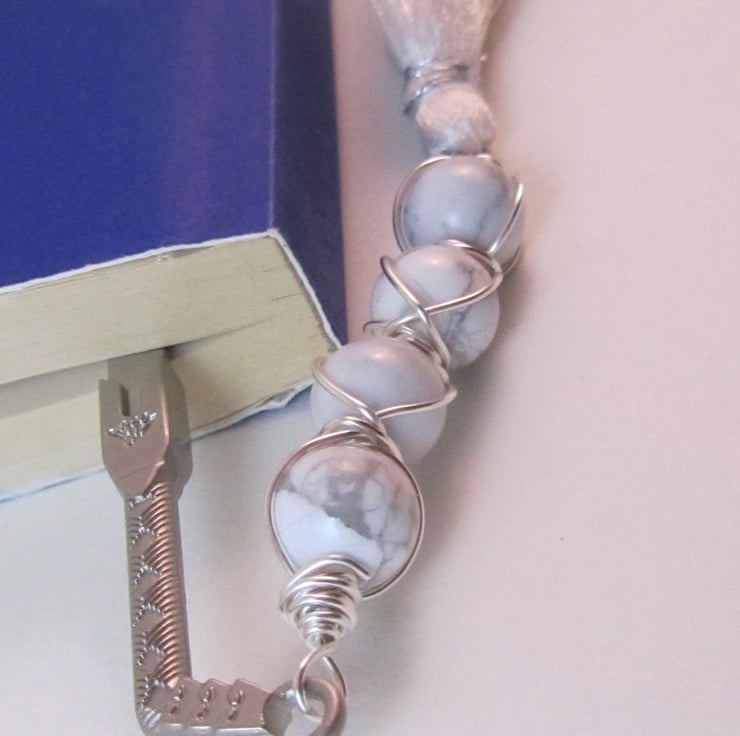 I enjoy creating wire wrapped bookmarks. The sword and tassel really went with the white howlite gemstones.