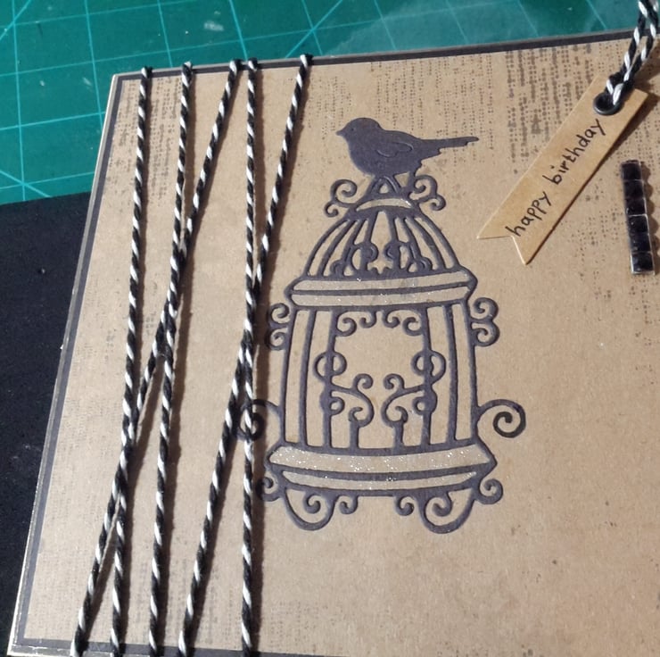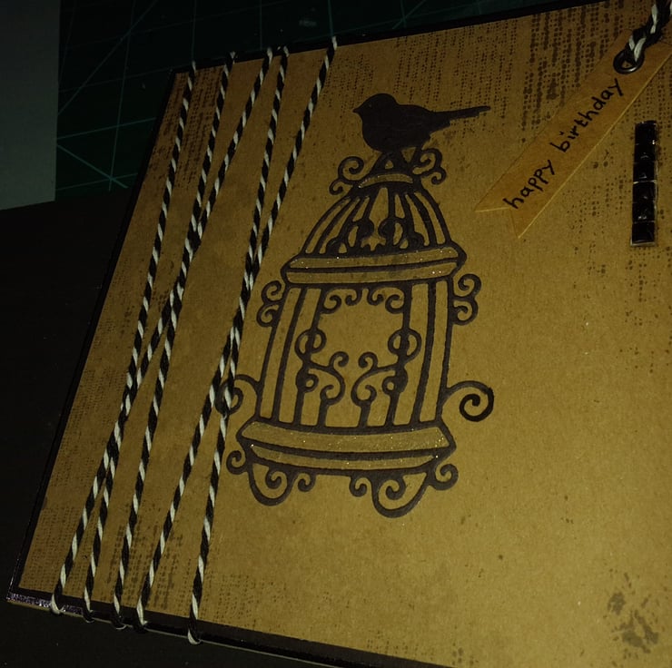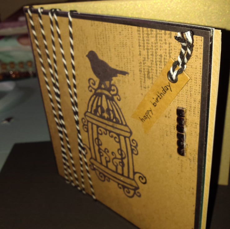 A completely handmade and uniquely designed card. Consisting of a bird atop a birdcage die cut from black card. Mounted onto vintage patterned paper then onto black card and then onto quality pristine white card. Black and White strapped butchers twine has been wrapped around the card. A happy birthday tag dangles from the top. Finished off with black rhinestones and fine silver glitter.