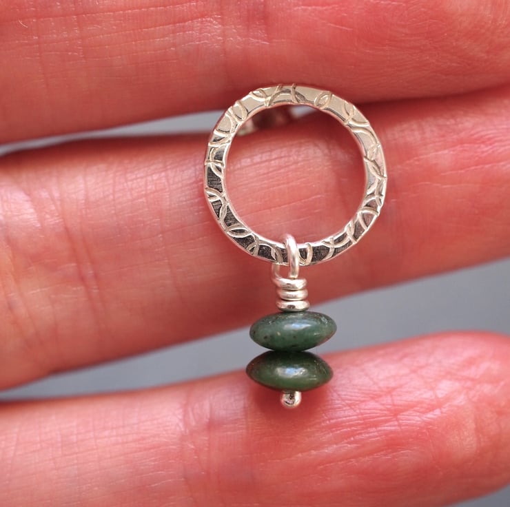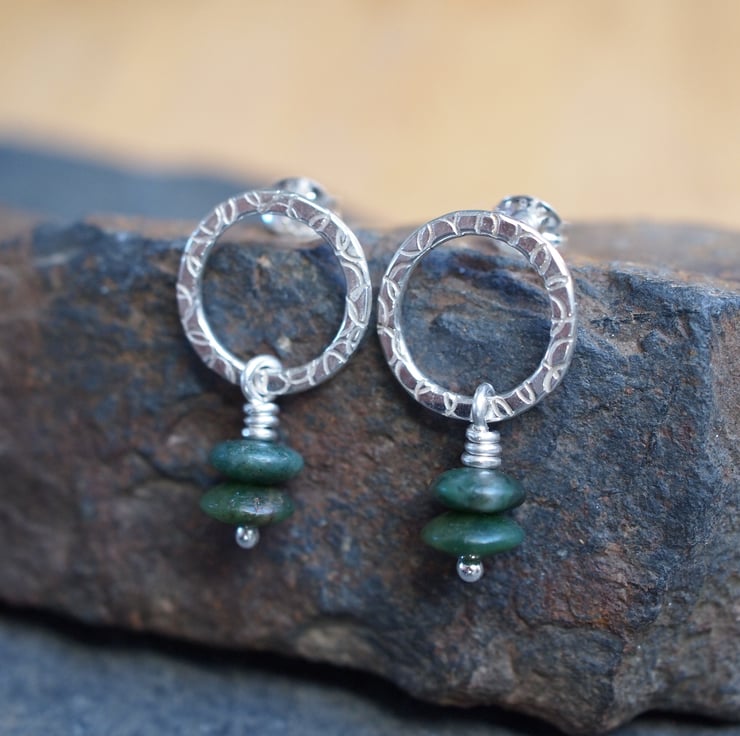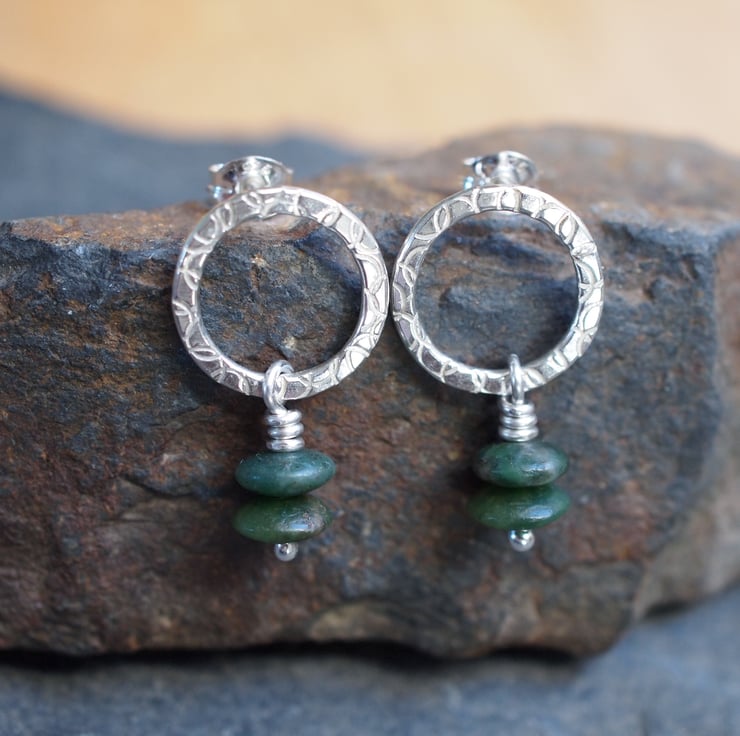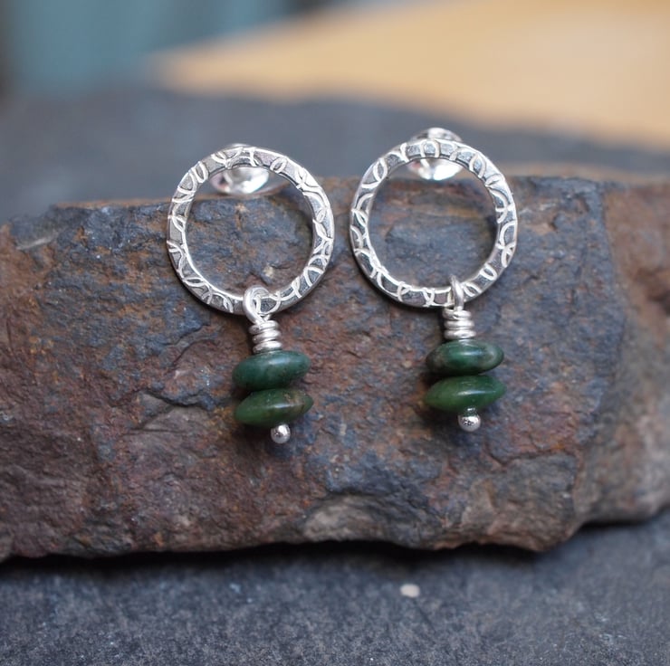 Sterling silver ring stud earrings with hand punched abstract pattern. The earrings have been further embellished with some lovely green jade beads that hang from each ring. The silver has been polished to a bright shine to finish.