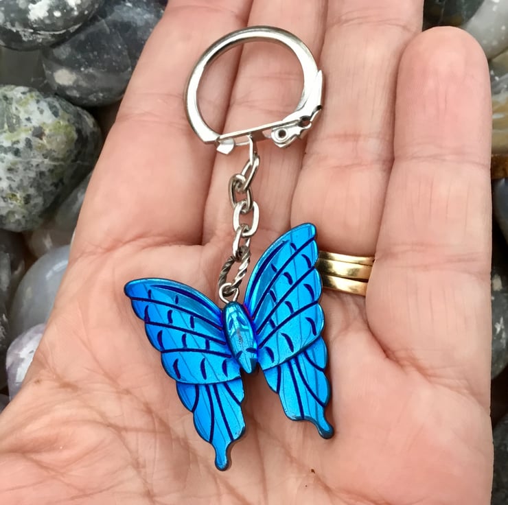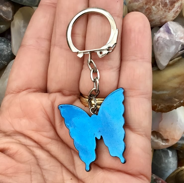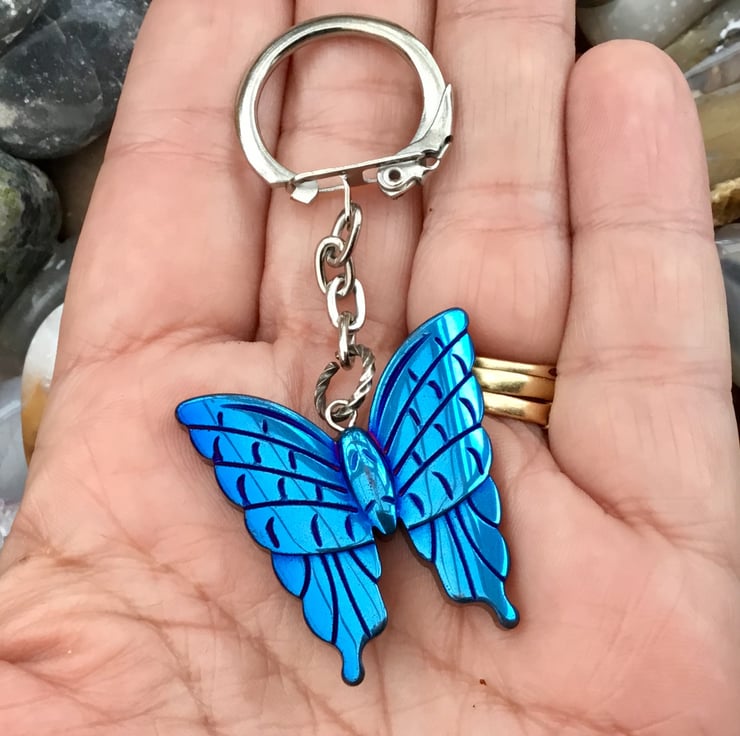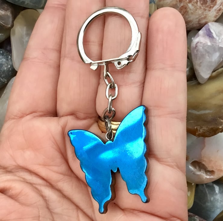 This Electric Blue beautiful Butterfly Titanium Rainbow Hematite, of varied hues, but mainly bright eclectic blue, has been set onto a silver tone round bail and keychain findings, with a latch grip clasp keyring, to allow this item to function as a keyring, or handbag charm if you prefer.