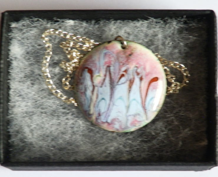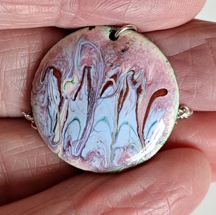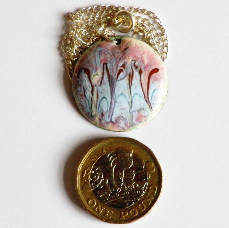 I achieved the design for this pendant by firing transparent dark pink and pale blue enamels over a white base, adding rods of red and blue-green enamel, then scrolling through the red hot enamel with a steel point. The patterns are random and unrepeatable, making the pendant a truly unique piece.