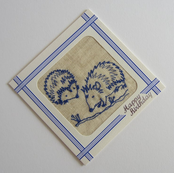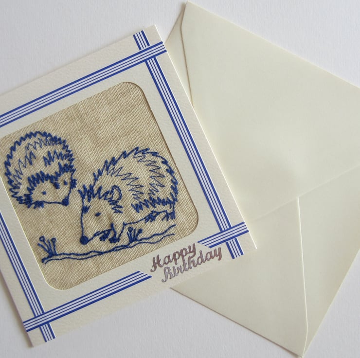 Handmade birthday card with a machine embroidered design of hedgehogs bordered by blue and white striped paper strips and a silver coloured Happy Birthday sticker.