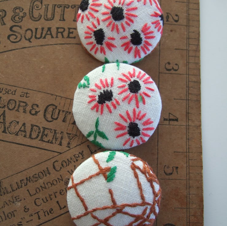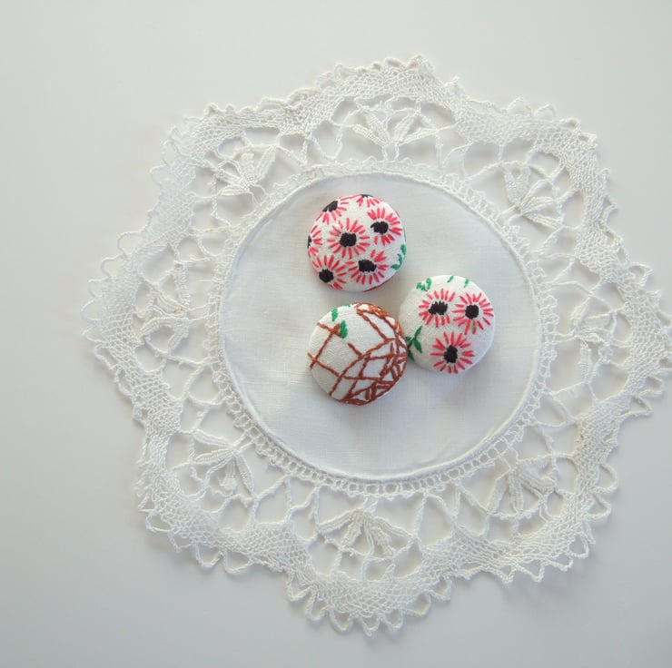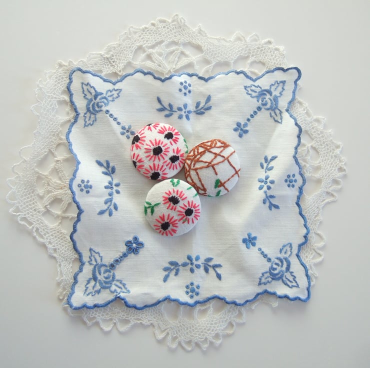 Three extra large buttons covered with vintage hand sewn embroidery. Mothers’ Day gift.