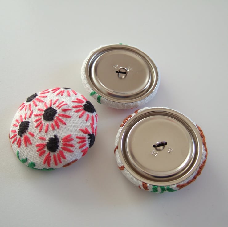 These jumbo size metal buttons are covered in hand sewn vintage embroidery. Tiny fragments of homemade table linen, which have been rescued, and given a new life and purpose.