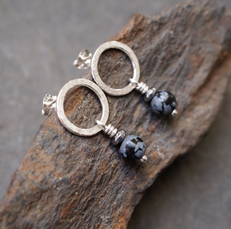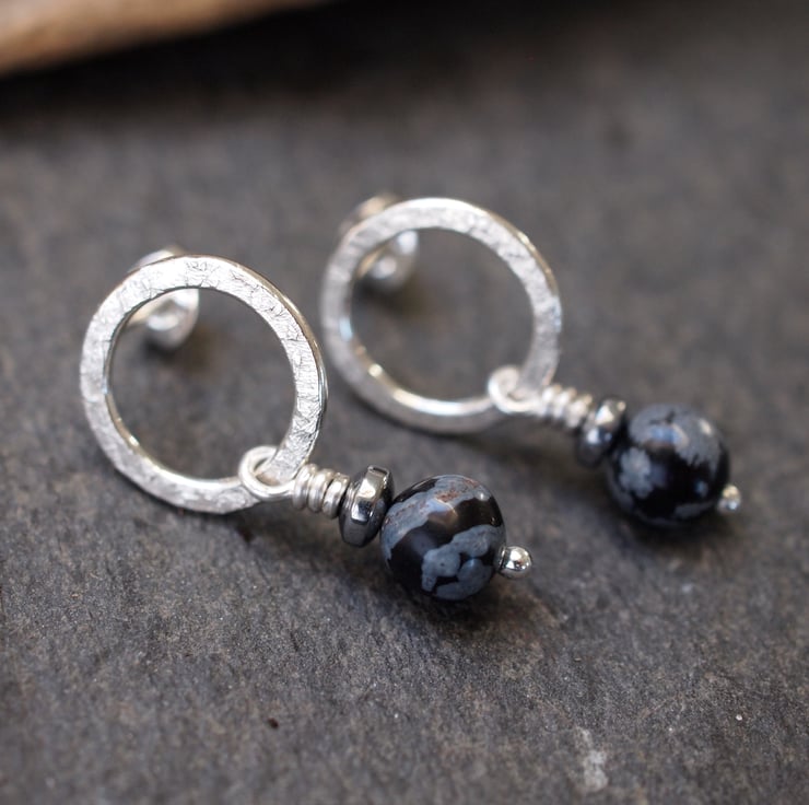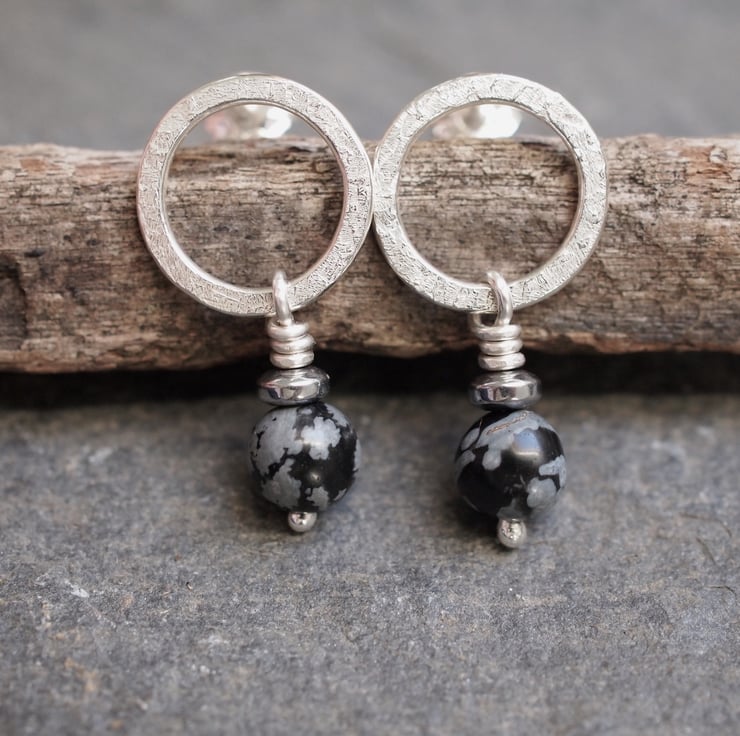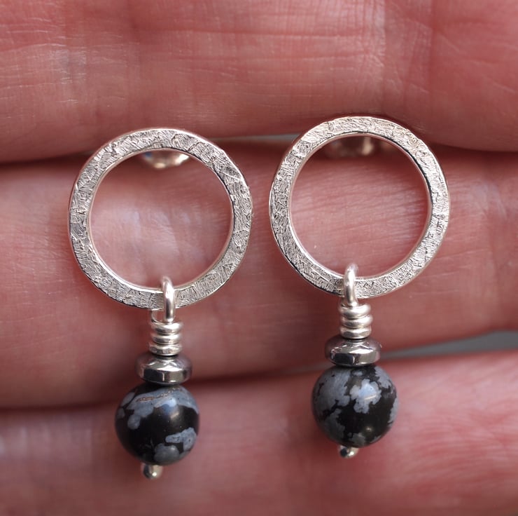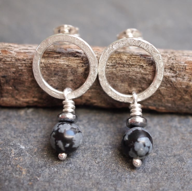 Handmade sterling silver stud earrings - textured silver rings with snowflake obsidian and hematite beads hanging beneath.