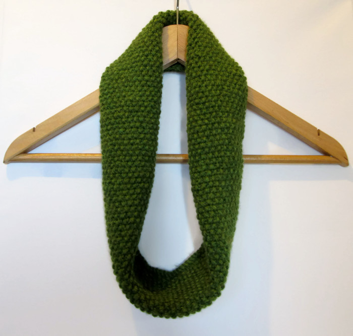 It is knitted in seed stitch on circular needles, so there is no seam, you just need to slip the cowl straight over your head to put it on. You can wear it wide or fold it inwards to wear it thinner (as in the photos).