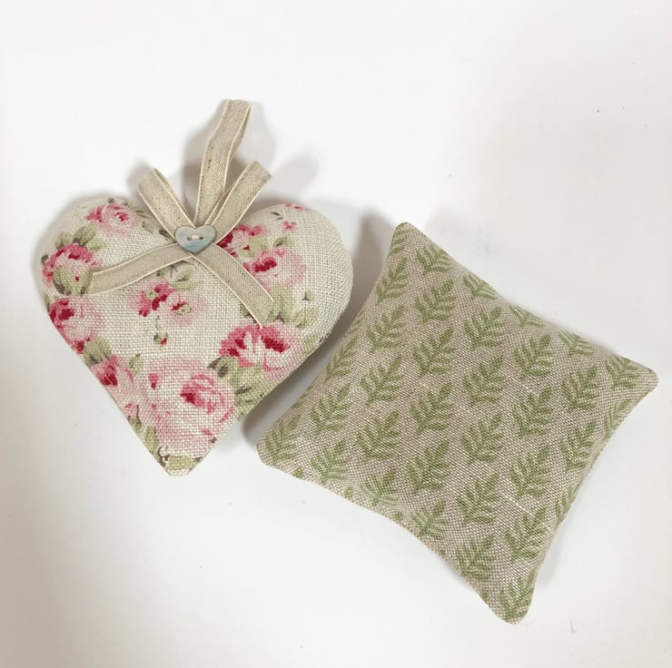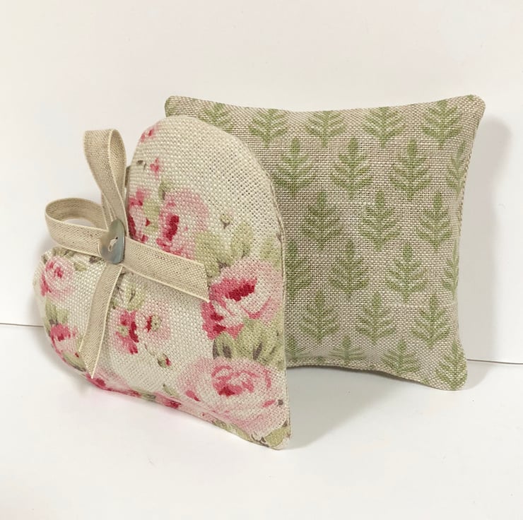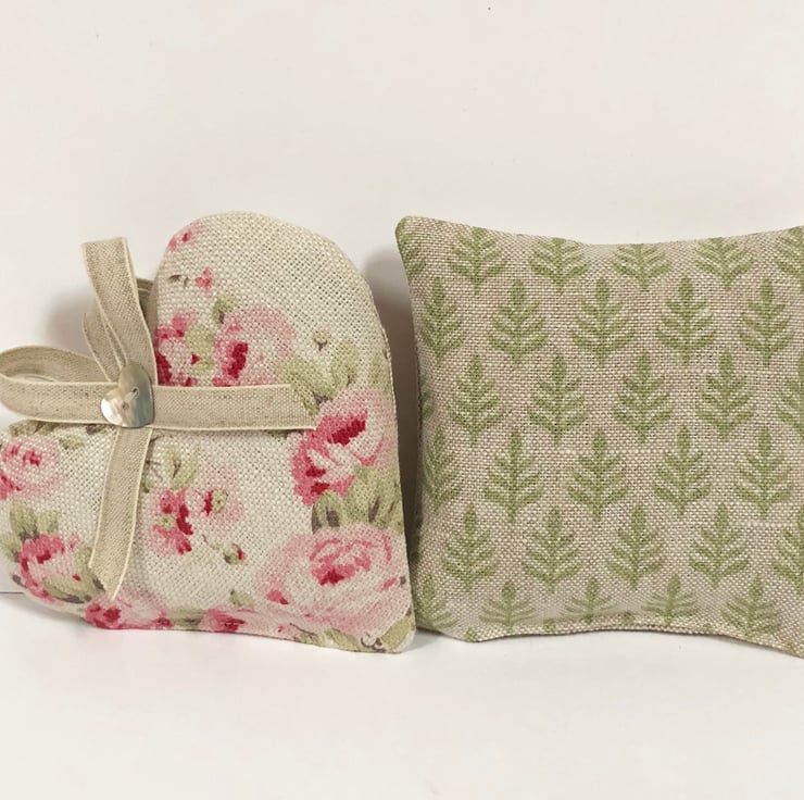 A pair of generously filled lavender sachets made from beautiful quality linen fabrics.The hanging heart sachet features a pretty floral design and the square sachet is made from a lovely contrasting design.The heart has a dutch linen tape hanger and has been decorated with a mother of pearl heart button.