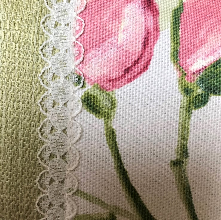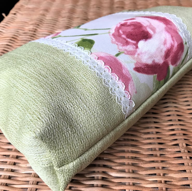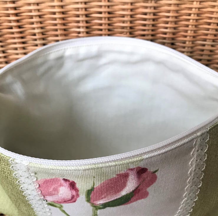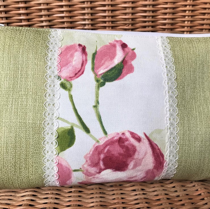 A large cosmetic bag in a fresh zesty green fabric embellished with a central panel of pretty floral print fabric. The floral fabric features lovely pink Roses and rosebuds on a cream background. The edges of the panel are trimmed with pretty cream lace. The make up bag has a cream zip and is lined with cream fabric. The base of the bag is boxed giving lots of space inside.