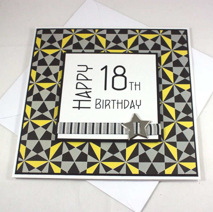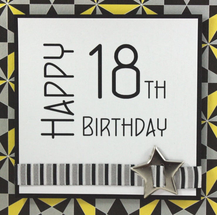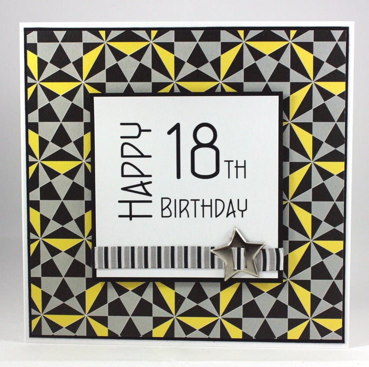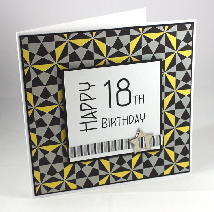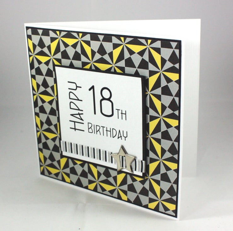 Square 18th birthday card with printed text reading 'Happy 18th Birthday' mounted on black card, overlaid onto a geometric pattern of black, grey and yellow shapes and embellished with a striped ribbon and a star shaped metallic brad.