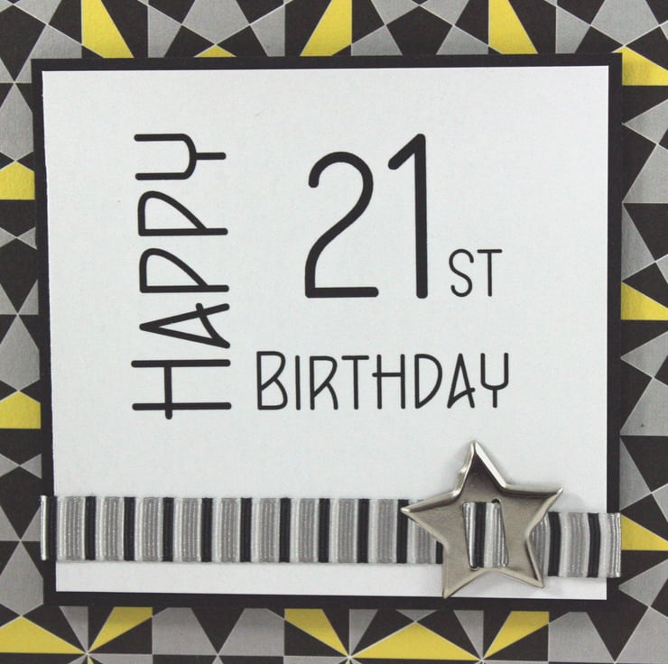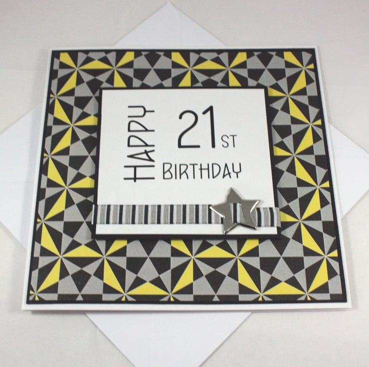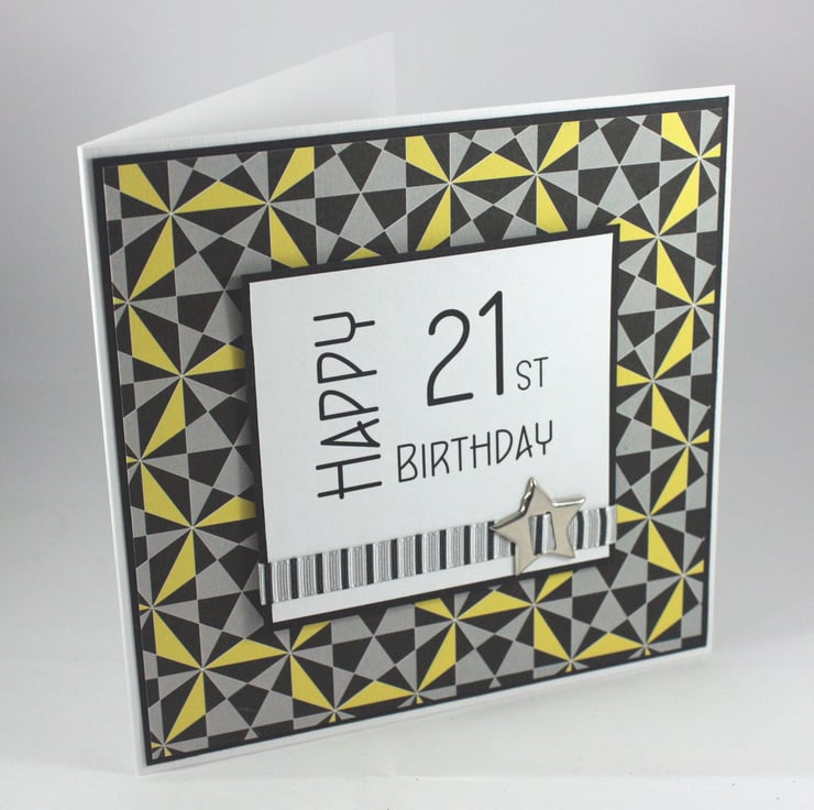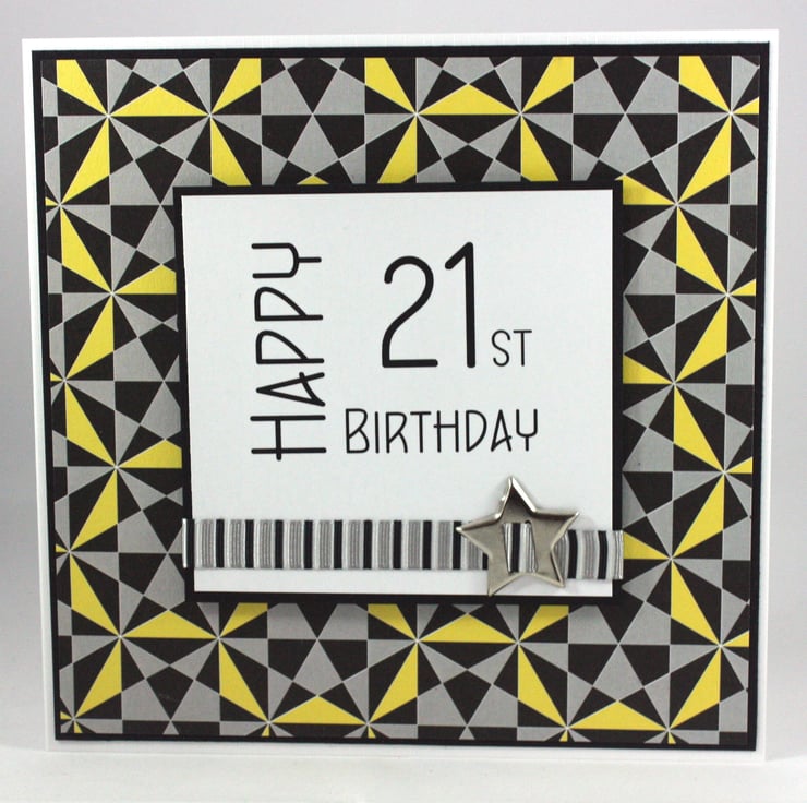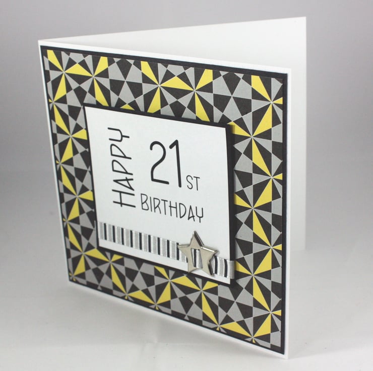 Square 21st birthday card with printed text reading 'Happy 21st Birthday' mounted on black card, overlaid onto a geometric patterned background of black, grey and yellow shapes and embellished with a striped ribbon and a metallic, star shaped brad.
