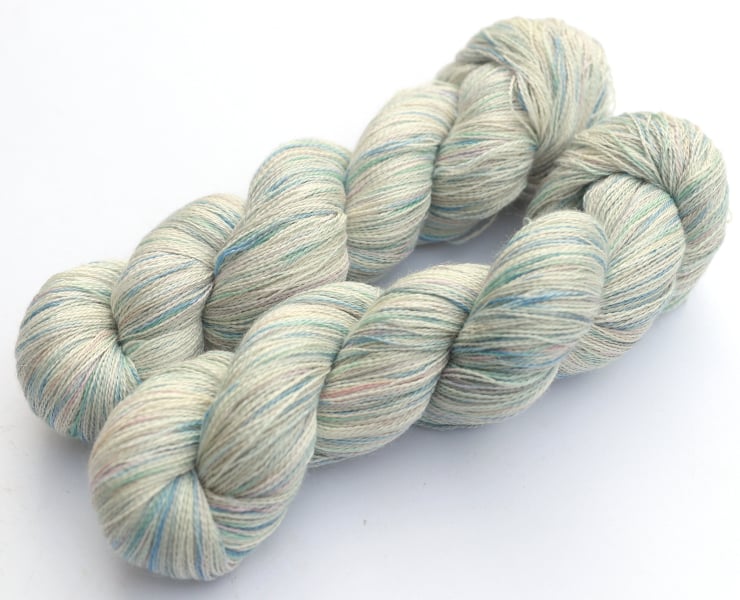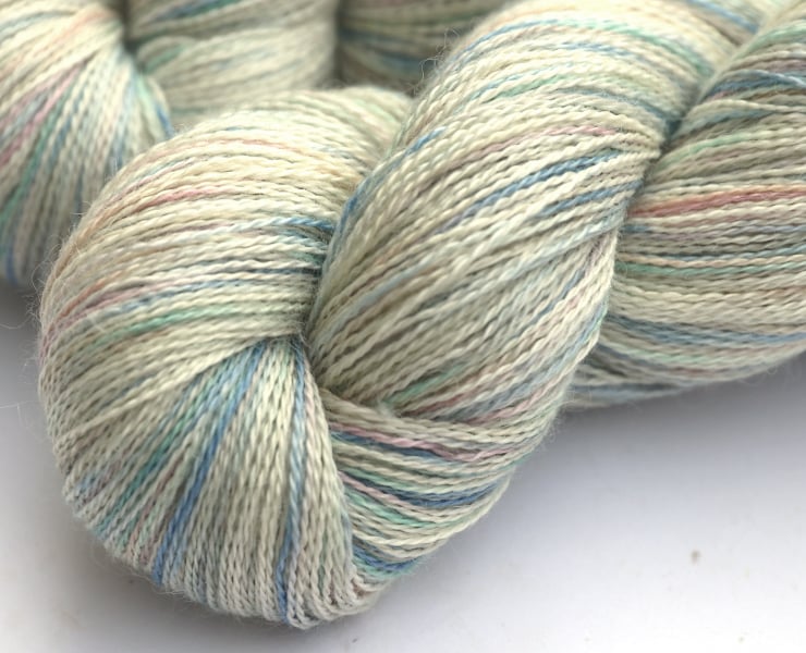 Cream/off-white (undyed) with flecks of pastel blue, green, blossom pink and hints of peach. This gorgeous and luxurious yarn has the softness and warmth of alpaca with the smooth sheen and cool feel of silk. It should make beautiful lace projects. There is one skein left. Photographs have been taken and edited in bright but wintery natural light.