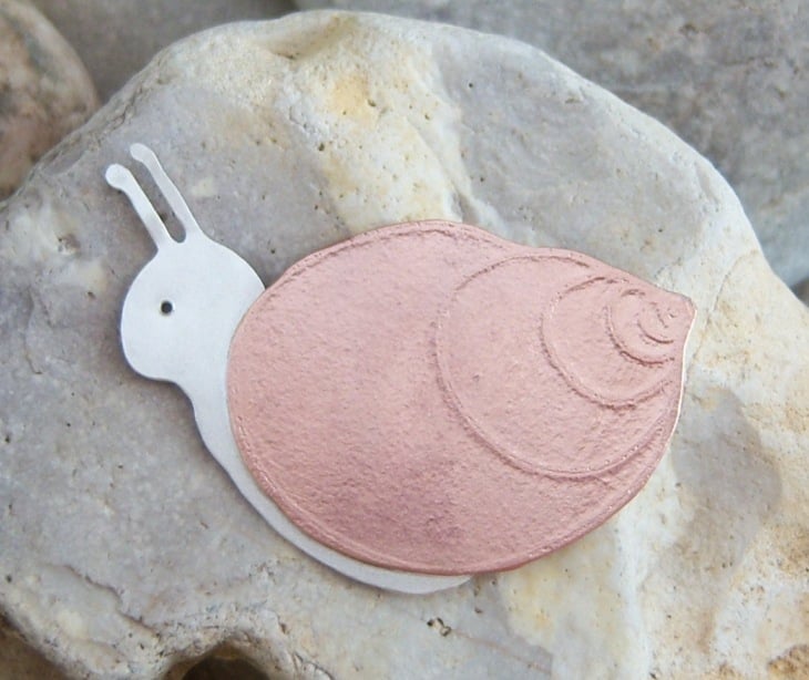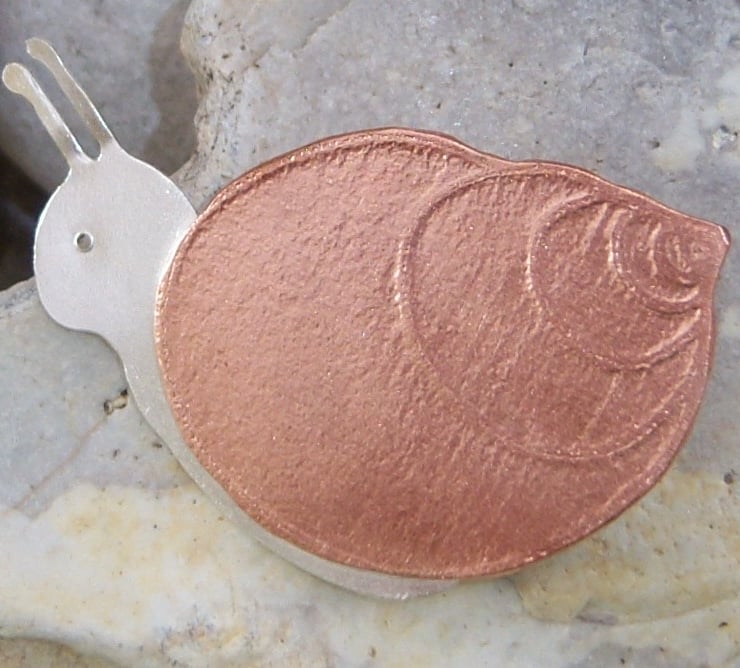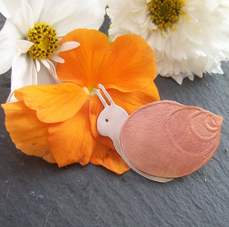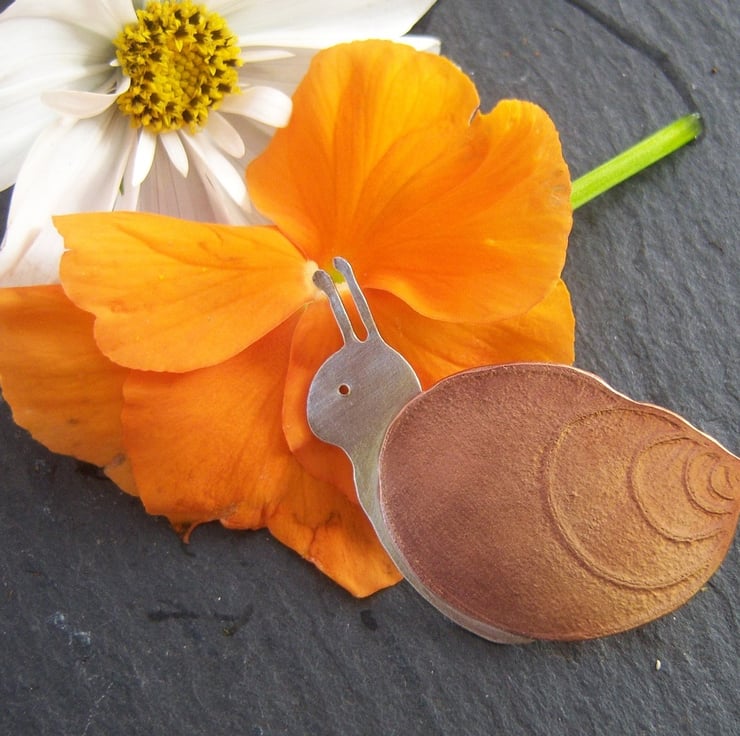 Snail brooch. The body and fastener are sterling silver, the shell is etched copper. Measures approximately 5cms from tip of antenna to the end of the shell.