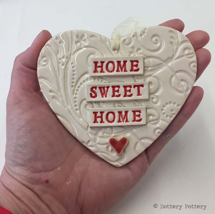 This ceramic heart is made from white earthenware clay, imprinted with pattern and colour and finished with a clear, glossy glaze.