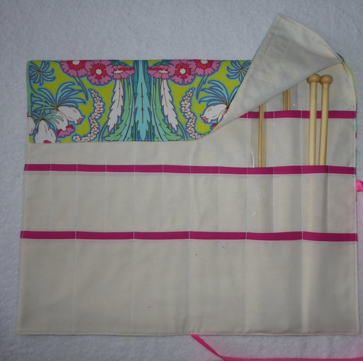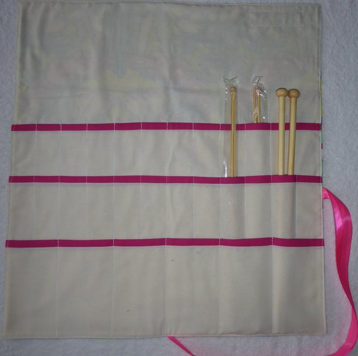 The top of the case is a flap which folds over to keep the needles safe. Once rolled up, there is a pink ribbon to secure the holder. It is top stitched to achieve a professional finish. Total size when placed out flat is 18" x 19".