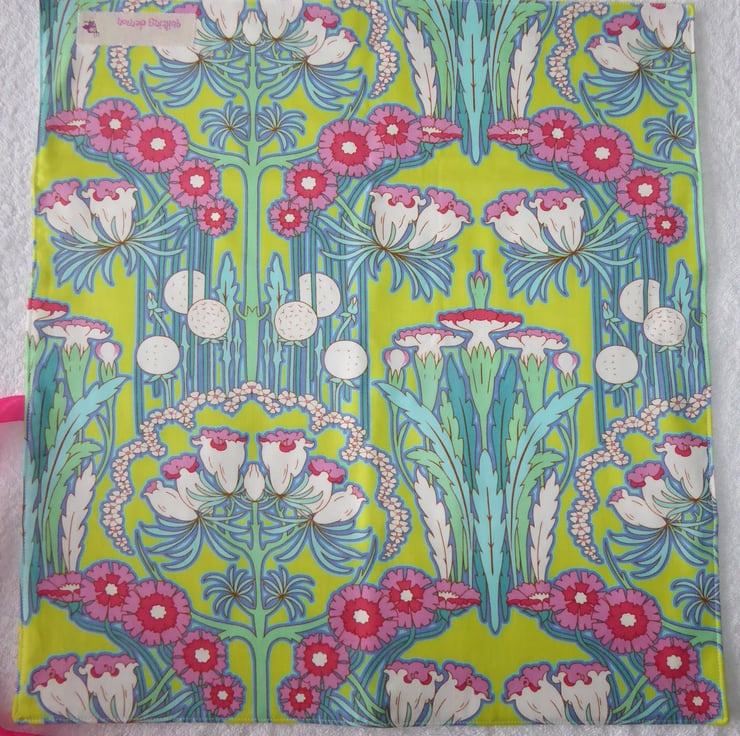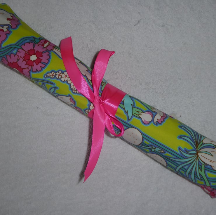 I have used this lovely floral print cotton print fabric to create this useful knitting needle case. The holder is lined with a plain cream cotton fabric.