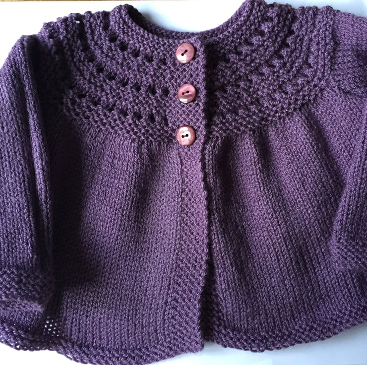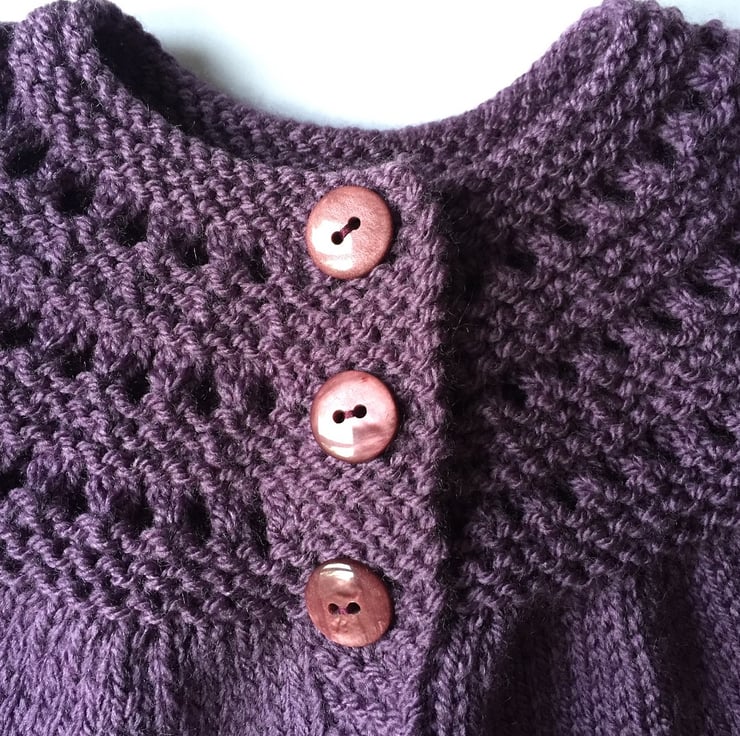 This is a lovely deep purple cardigan with delicate detail around the neck