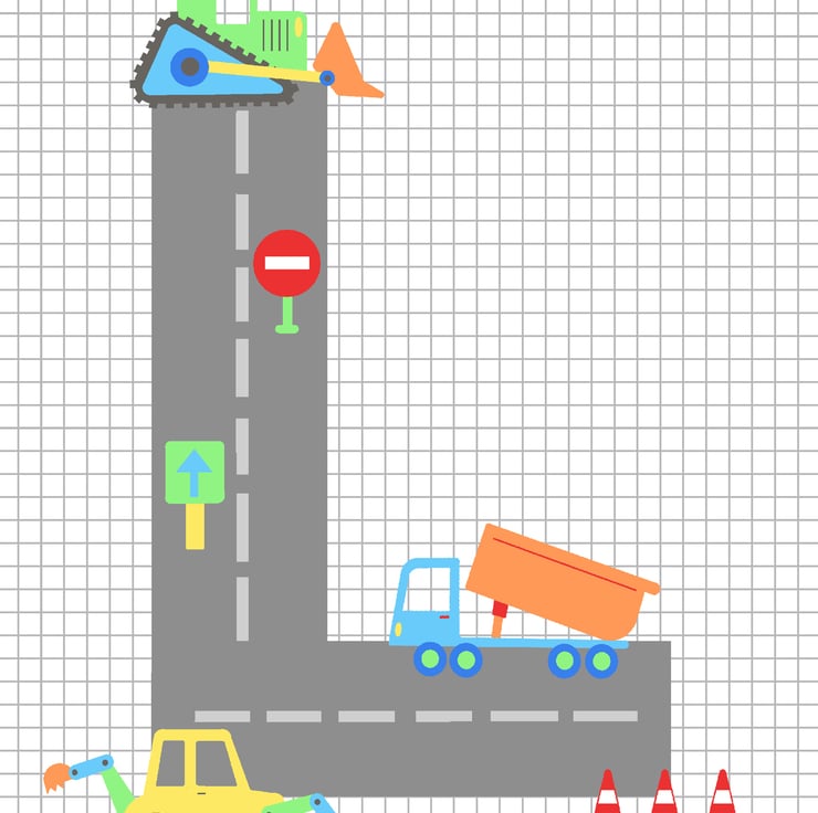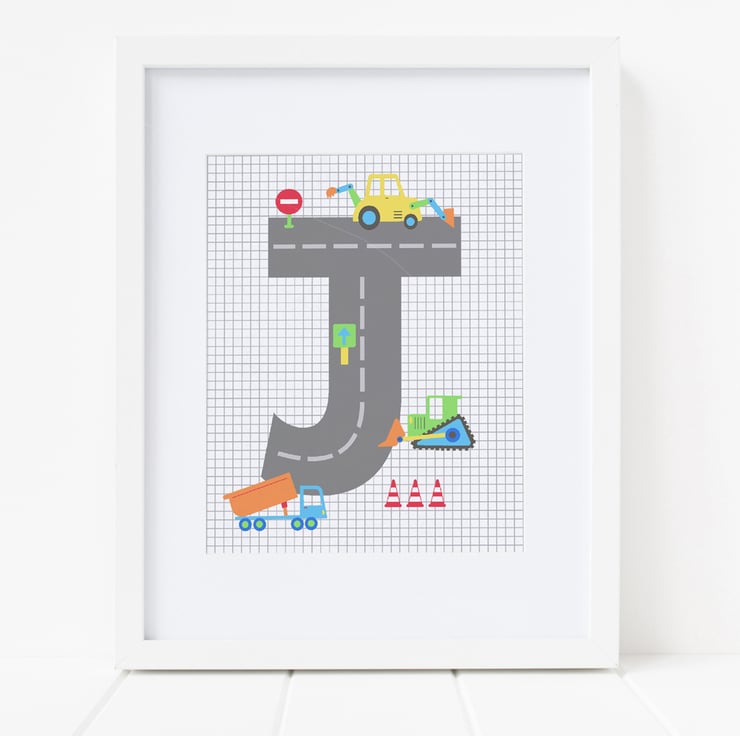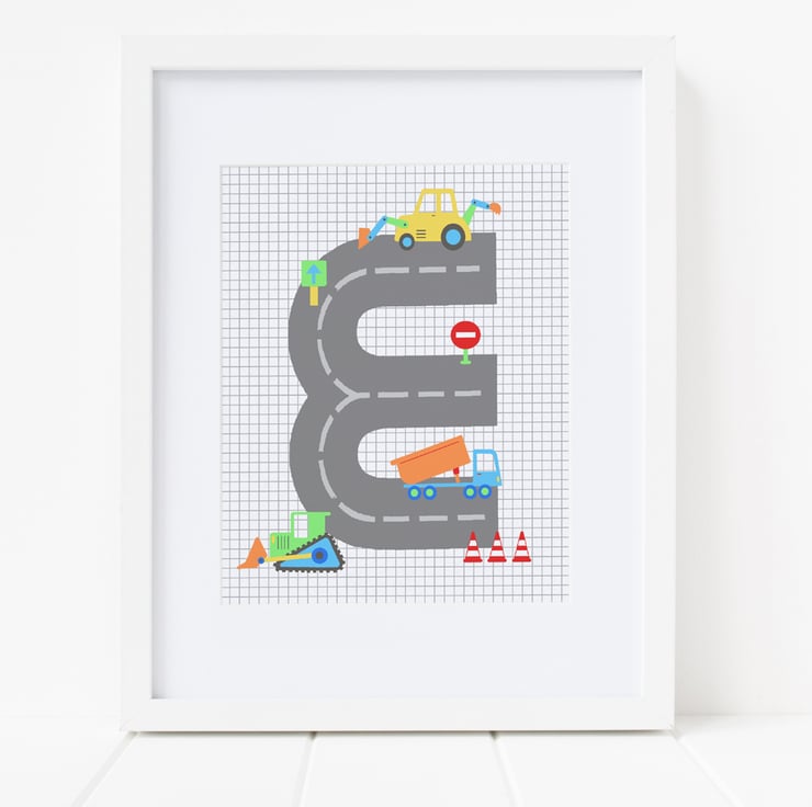 This boys digger print features a digger, a dumper truck and a bulldozer and is personalised withr the little boys intial. It would be perfect for a baby boy's nursery or little boys bedroom and would make a lovely gift.