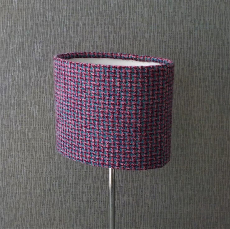 Here is a little lamp shade for a table lamp or wall light. This one is a an oval shape, 20cm by 14cm diameter, and 15cm tall. The outside is a colourful pink and blue design of the world renowned Harris Tweed hand-woven wool fabric. Inside is the standard fire-retardant pvc, safe to use with regular 40W candle bulbs or 8W low energy bulbs.