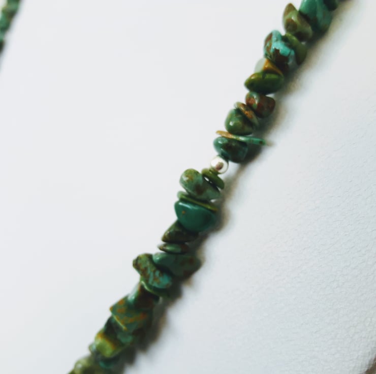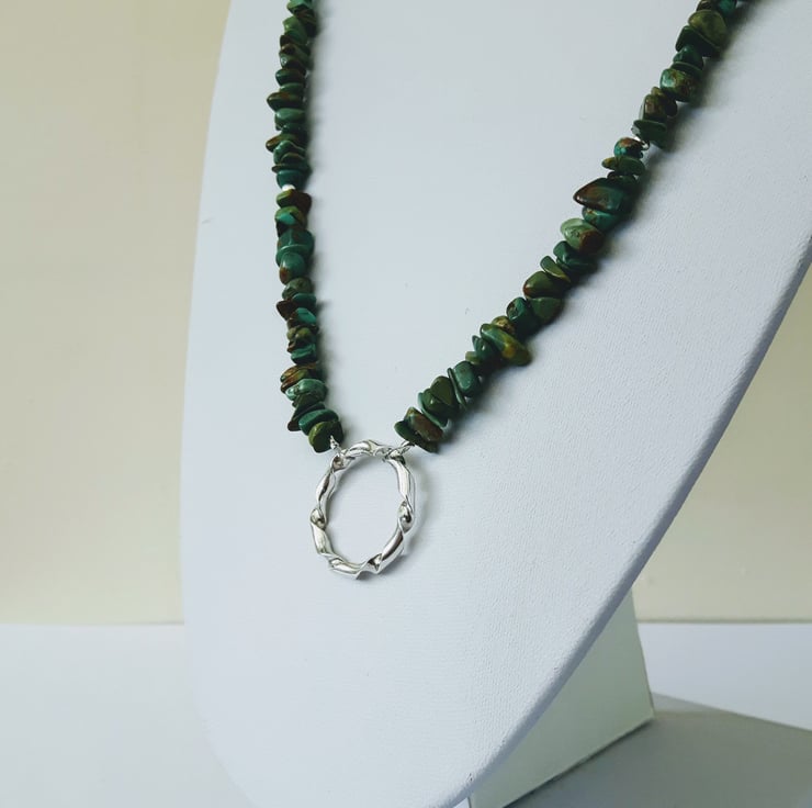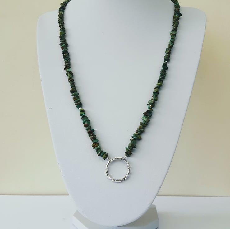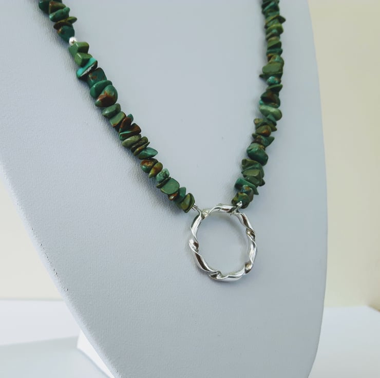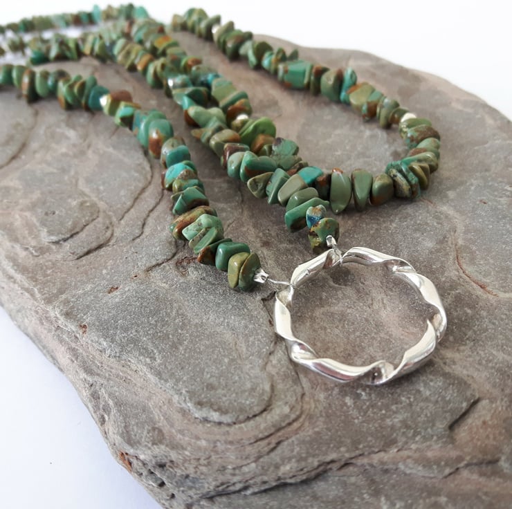 This is a longer style necklace featuring turquoise nuggets complemented by sterling silver round beads and a twisted silver circle which I have used as a focal point at the front. A great necklace for both informal and formal wear. The colours include turquoise, shades of green, yellow and amber. The beads are mounted on strong beading wire and the overall length is 30inches/75cm. There is no need for a clasp as the necklace is long enough to go easily over the head. This item will be packaged in a smart gift box and sent to you by Royal Mail first class post.