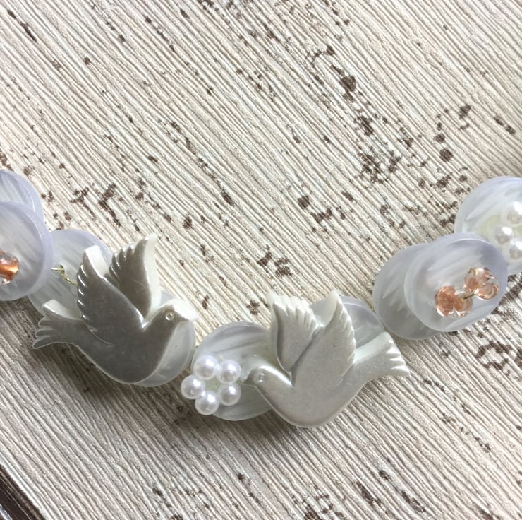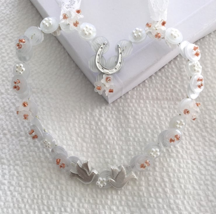White acrylic flowers in groups of three with seed bead centres embellish the heart together with two doves, flat pearl flowers and a silver horse shoe.