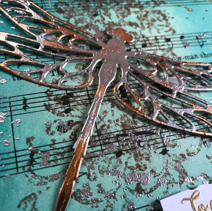 Embellished with a die-cut copper dragonfly splattered with silver embossing powder