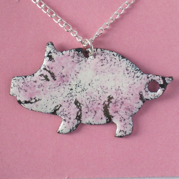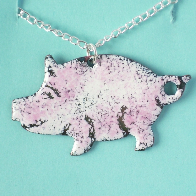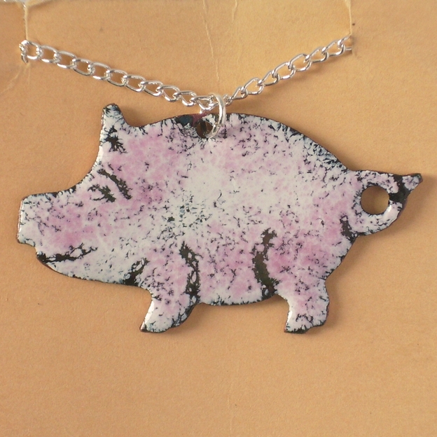 The pig measures 40mm, snout to tail, 24mm ear-tip to trotters. I have mounted the pendant on a 45cm silverpated, curb chain that fastens with a simple bolt ring.