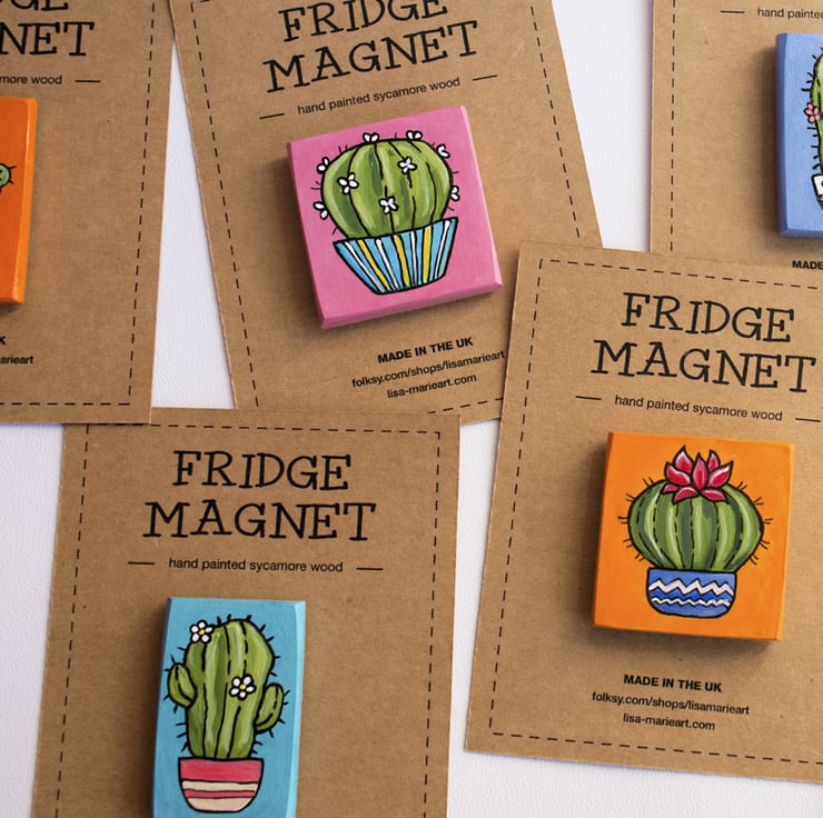 Each one is made from sycamore wood (hardwood) and lovingly hand painted with a potted cactus design. The attached ferrite magnet will sufficiently hold notes and photos to your fridge. Coated with gloss varnish for extra protection.