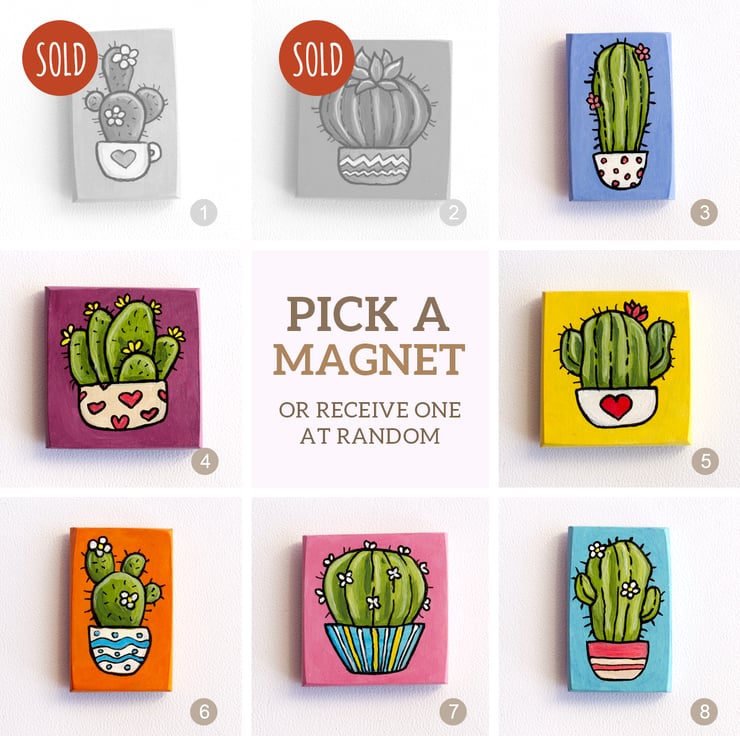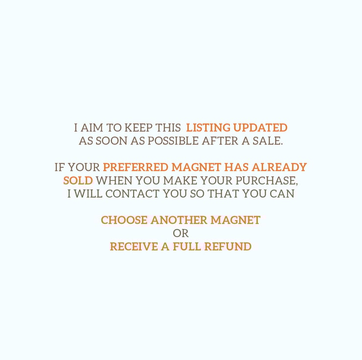 I aim to keep this listing updated as soon as possible after a sale. If your preferred magnet has already sold when you make your purchase, I will contact you so that you can choose another one, or receive a full refund.
