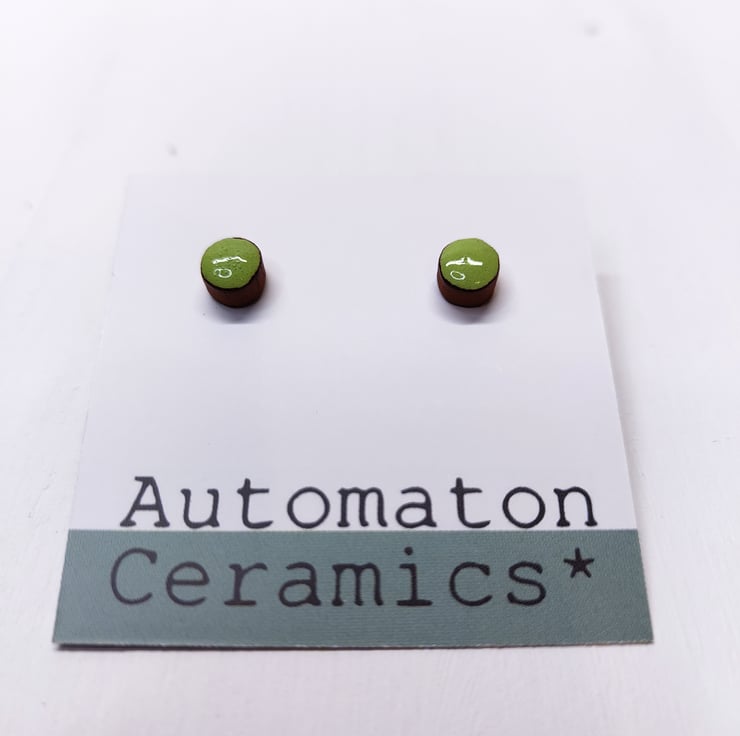 These small terracotta ceramic ear studs are made from a sanded Etruscan clay, each one is individually cut out and shaped and then painted with slips. They are fired once then hand painted with a glaze, this final firing brings out the deep purple brown of the clay and bright jewel like colours of the glaze. Each pair has a rustic hand made finish. They have silver plated studs securely glued to the back.