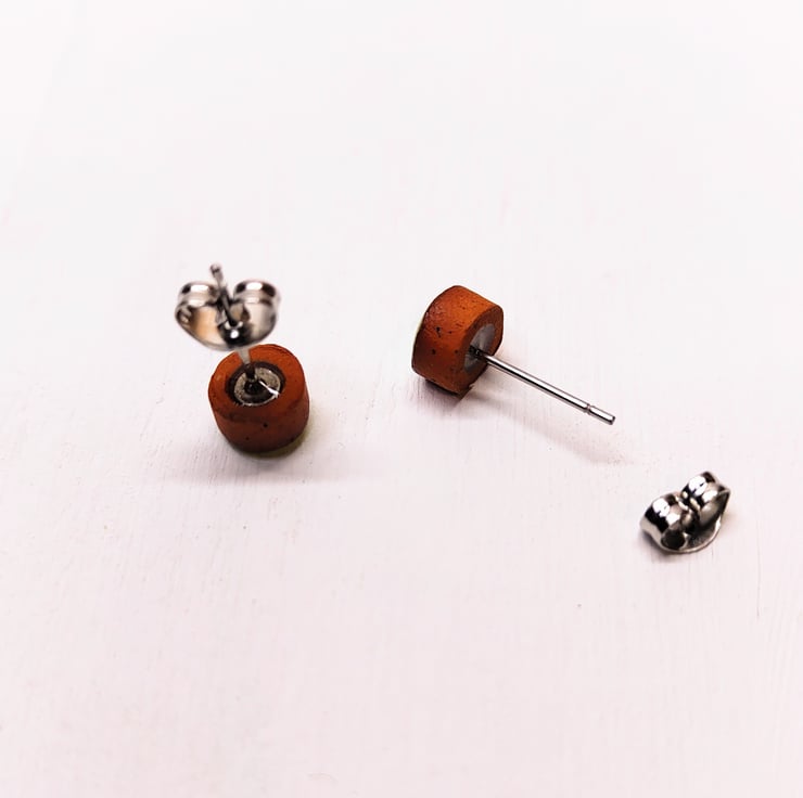 I have designed these ear studs to be small and to have a pop of bright colour, they can be worn as a pair or (like me) individually. I also wanted to use a terracotta clay, something you don't often see in jewellery.