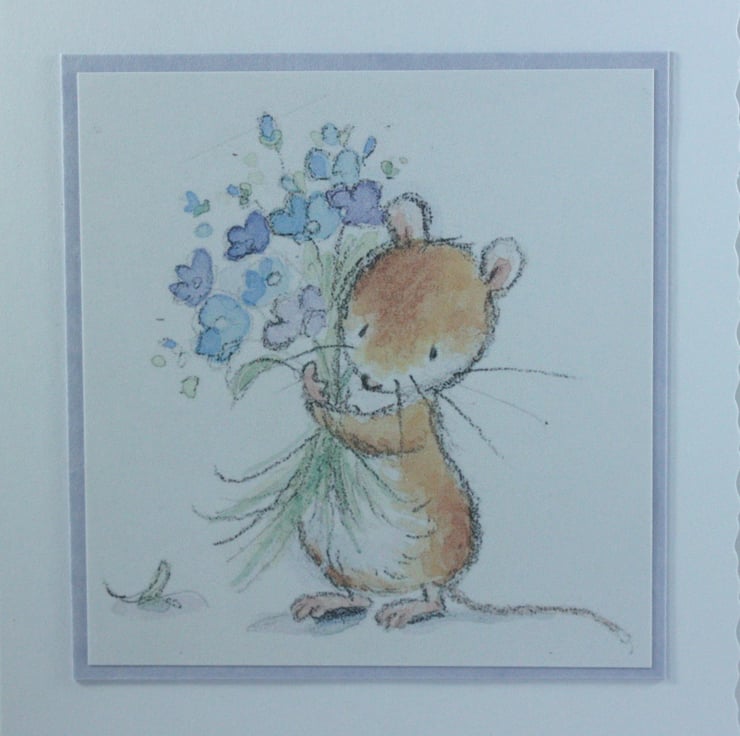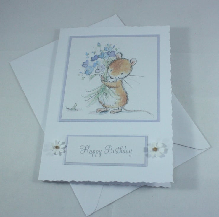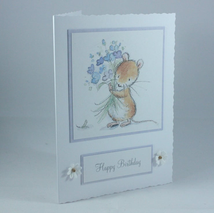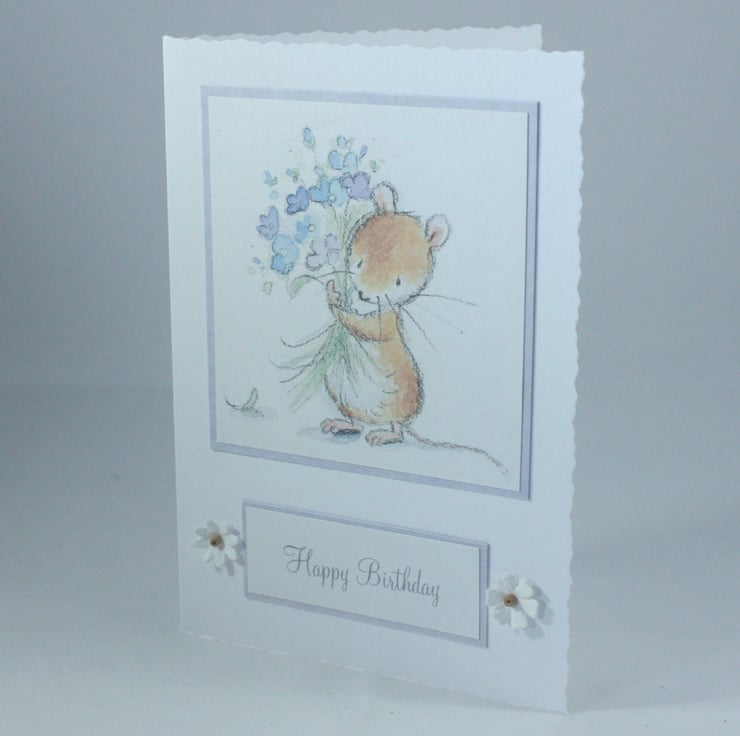A6, deckle edged birthday card featuring a cute image of a mouse with a bouquet of flowers. The image and accompanying message 'Happy Birthday' have been mounted onto pale lilac card. The card has then been embellished with two paper daisies.