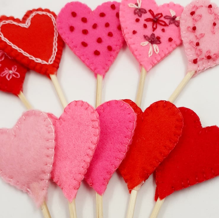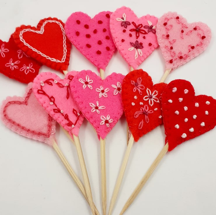 A set of 10 felt cake toppers on bamboo sticks. The hearts are hand cut from four different shades of pink plus red. The front of each is embroidered in pinks , white and red and is hand stitched to a felt backing. Each heart is approximately 5 cm and the exposed length of stick is about 6 cm