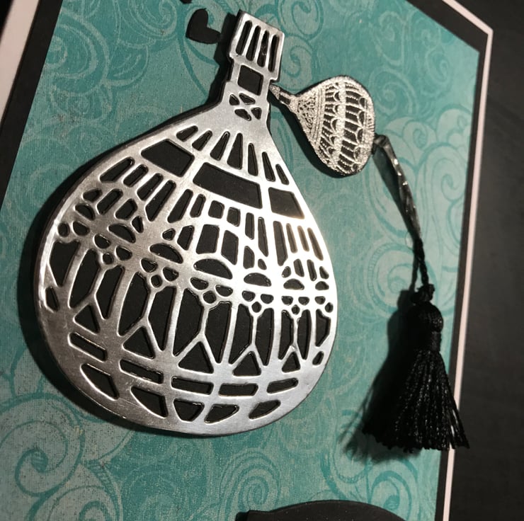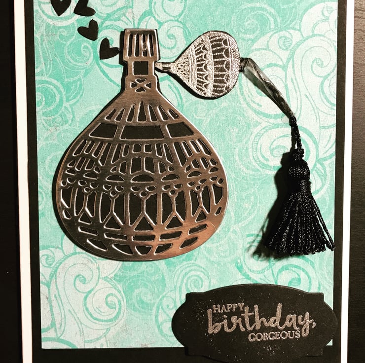 "Happy Birthday Gorgeous" stamped, heat embossed in silver and adhered onto card front