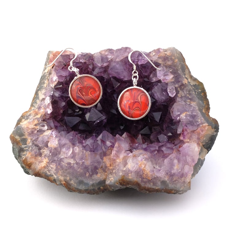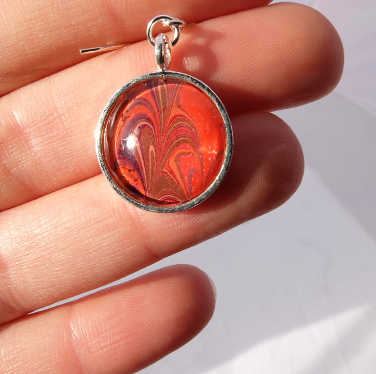 This lovely pair of earrings feature a piece of my marbled paper made onto a red base paper set into silver plated settings and capped with a clear glass cabochon. Featuring a red and purple colourway in an American pattern makes them a beautiful pair of statement earrings. There is a matching pendant for these earrings.
