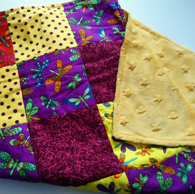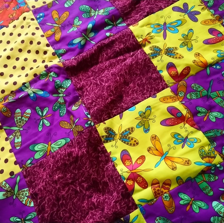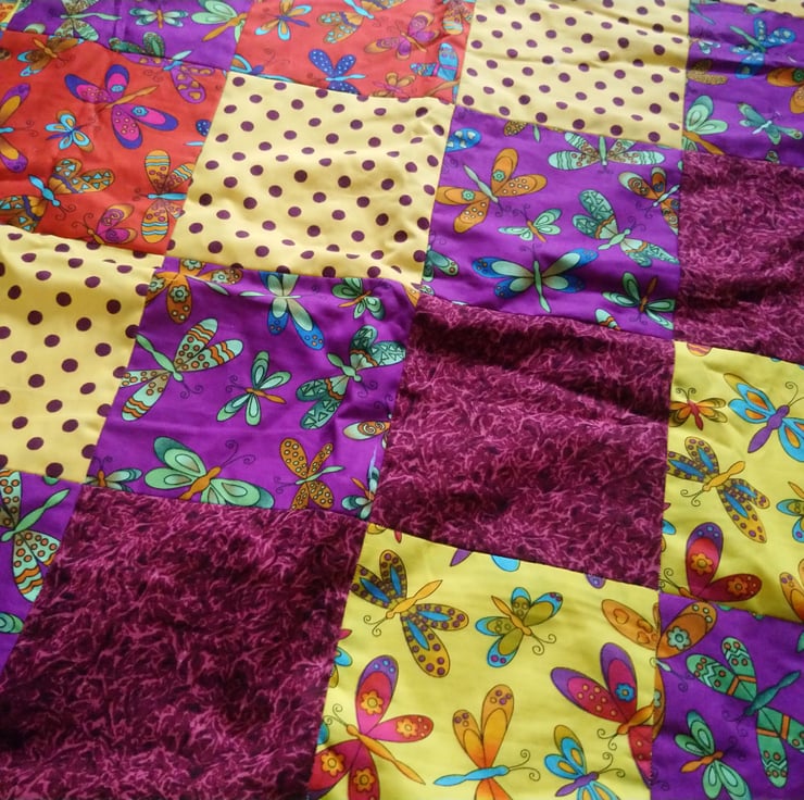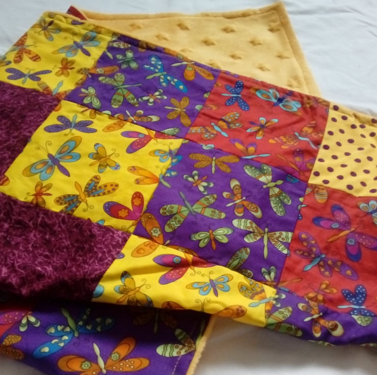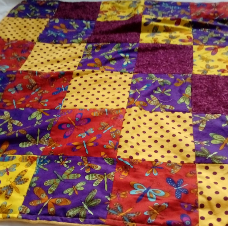 This is a patchwork blanket featuring dragonflies in different complimentary colours on red, yellow and purple background fabric colours.