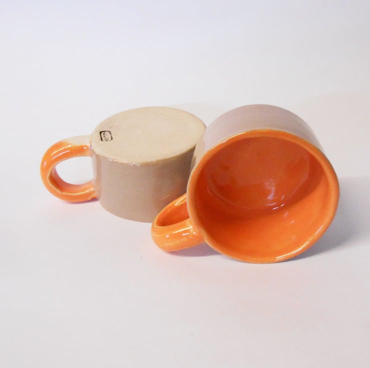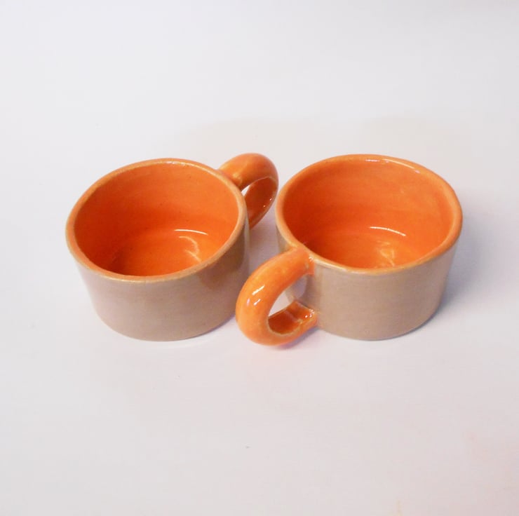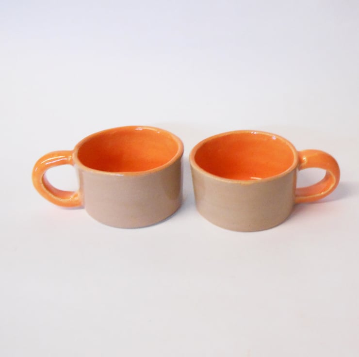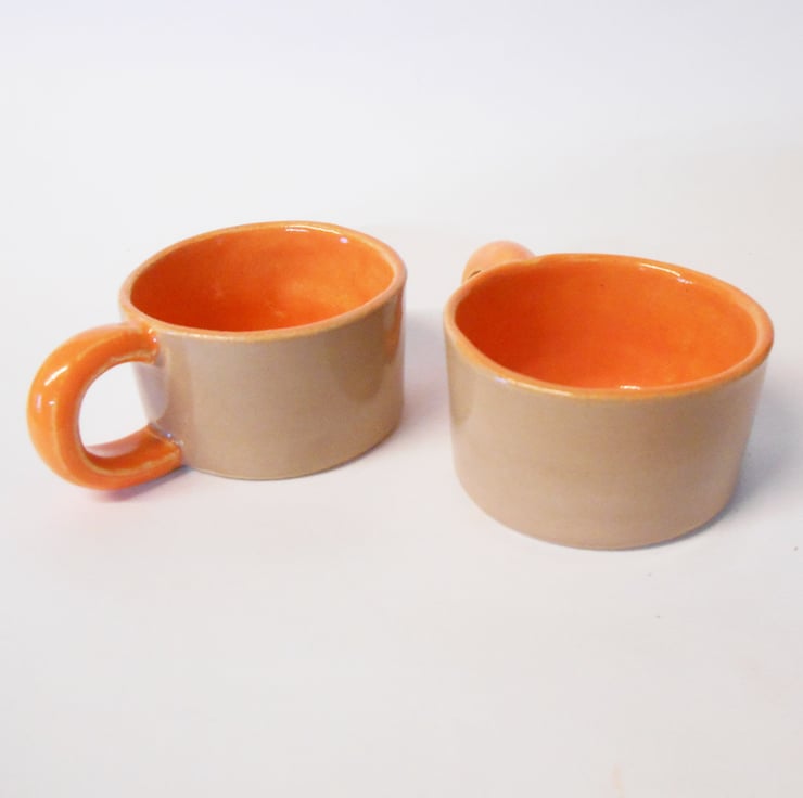 The interior and handle are glazed with shiny Bright Orange glaze, and the outside is glazed in shiny Taupe glaze.