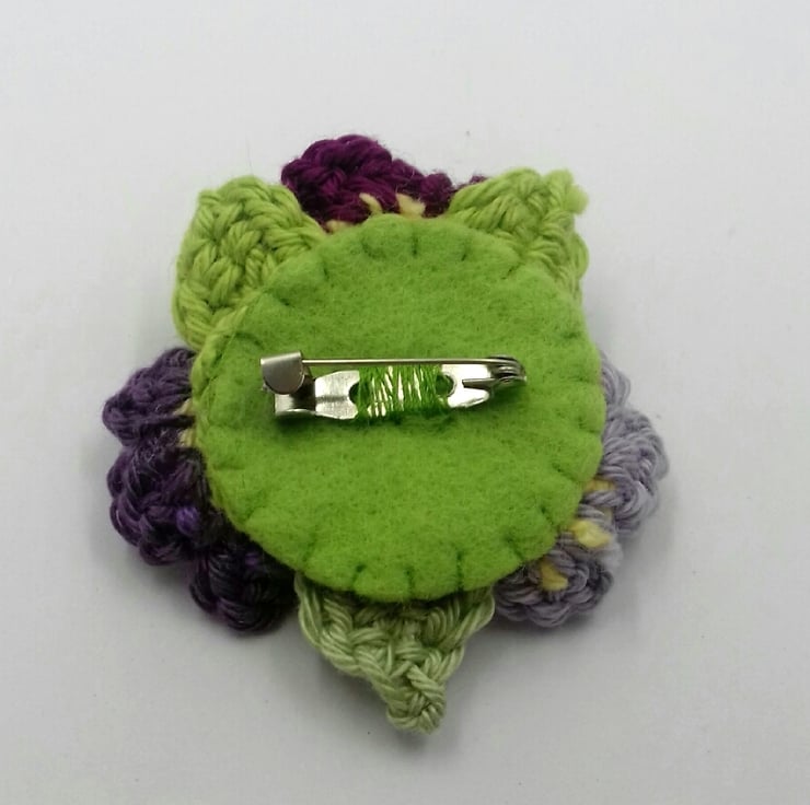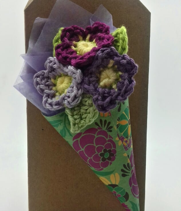 The wrapping paper is lightly filled with polyester wadding and tissue paper to prevent it from flattening. The flowers and leaves are crocheted in 100% cotton and stitched to a felt backing. The