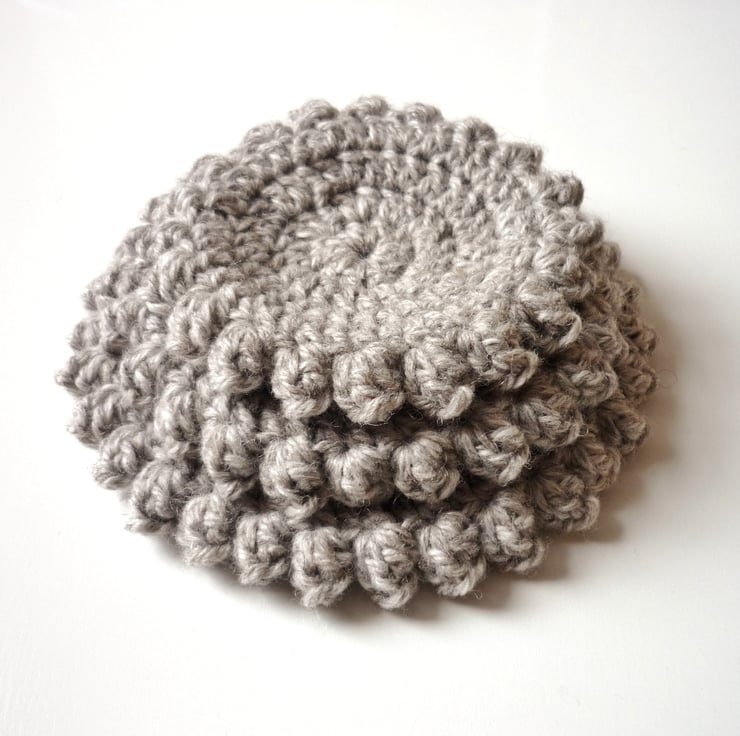 They measure about 10cm (4in) / 12cm (5in) / 14cm (5.5in) in diameter. They are hand crocheted in wool blend yarn in light grey with hints of white, beige and black.