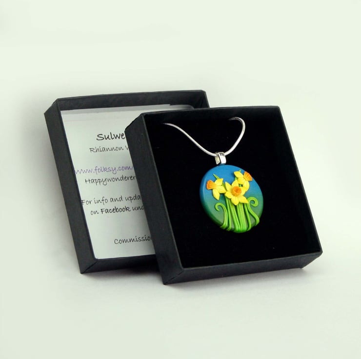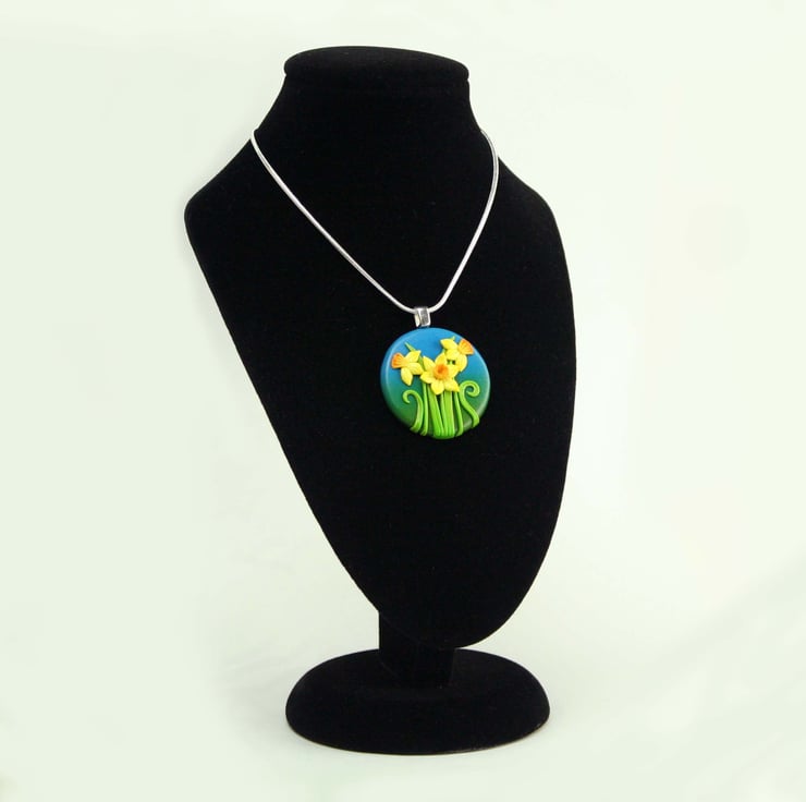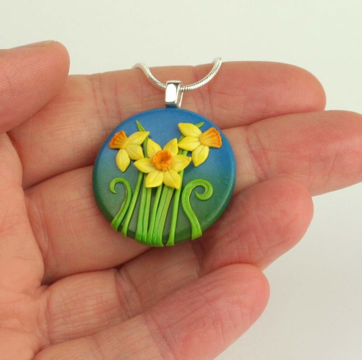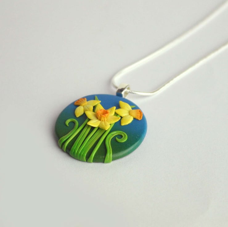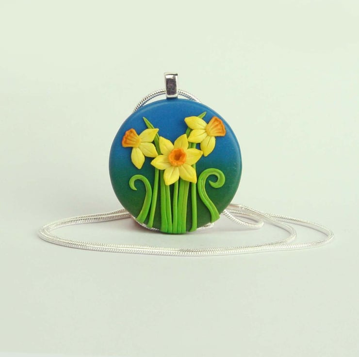 Here i have celebrated the daffodil and spring in my own way by creating this necklace from polymer clay. Each petal and leaf has been sculpted by hand using different coloured clay's and placed on a colour blended polymer clay background. Once baked its given a silk varnish finish.
