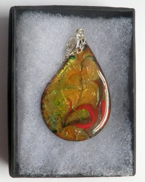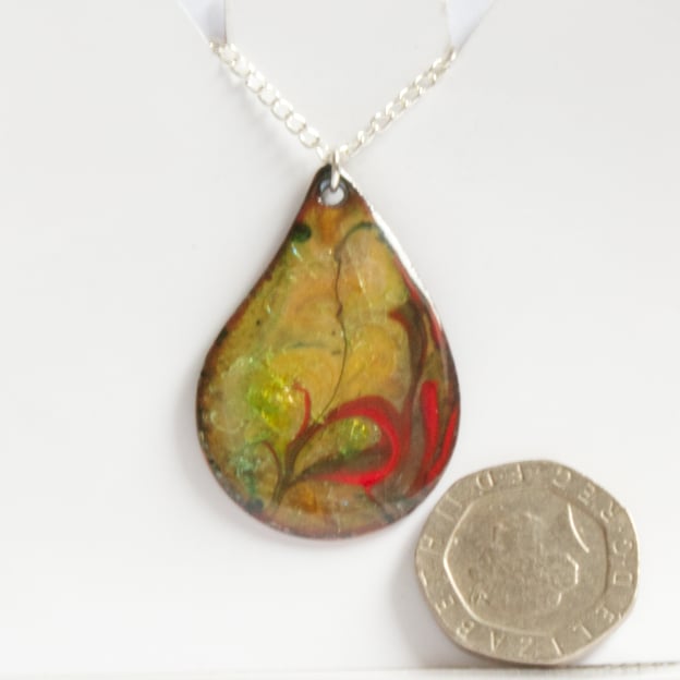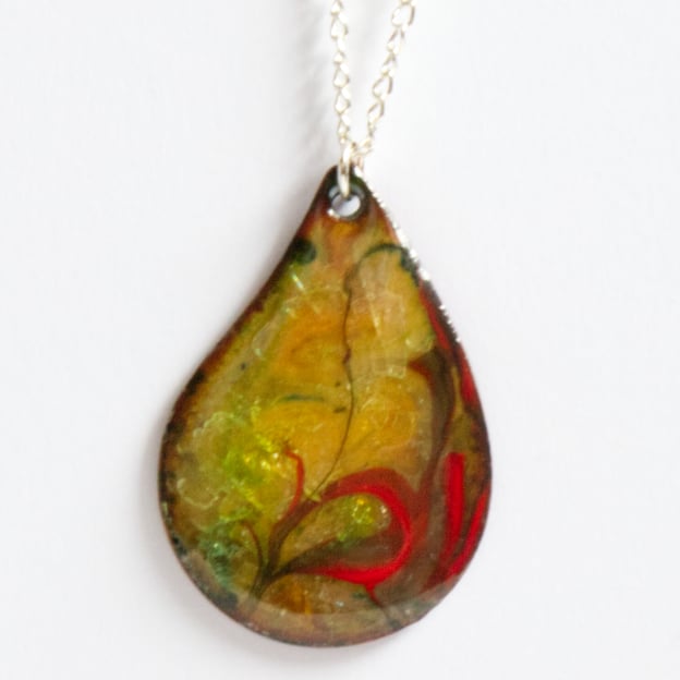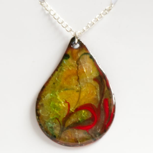 This tear-drop has been enamelled with several layers of clear enamel over which I have laid rods of red and red -brown enamel. When these were being fired I drew through them with a steel point to make the arabesque pattern that decorates the pendant. The copper base show through the clear enamel in tones of golden brown tinged in hints of lime green. I have no explanation of the provenance of the lime green; I suspect it comes from some impurity in the copper.