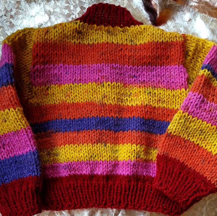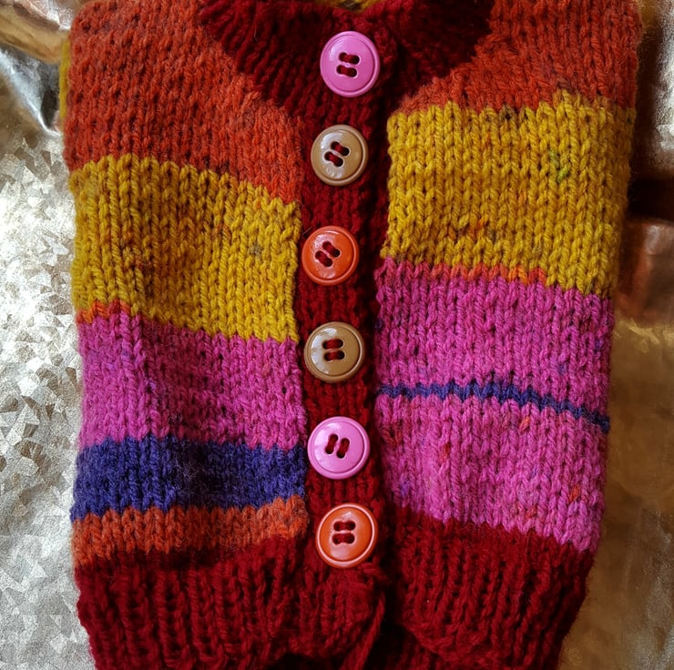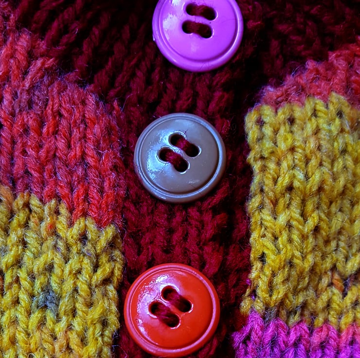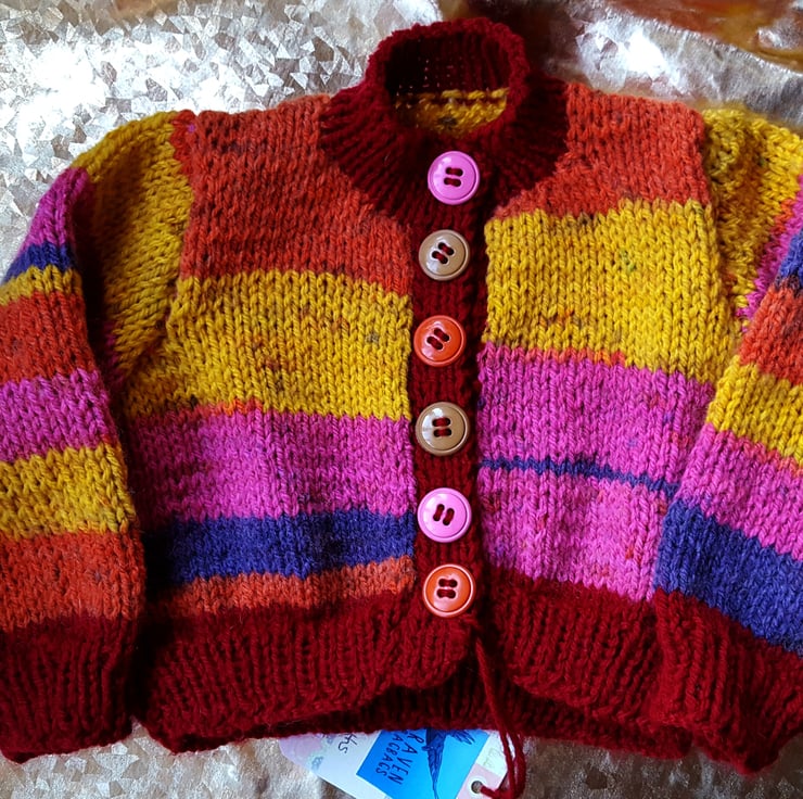 This is a gorgeous little baby cardigan hand knitted with bright and sunny shades of sunshine yellow, orange, pink, purple and deep red. Six little buttons in orange, pink and toffee make this a very special and smart little cardigan. The yarn has a soft feel and is washable at 30 degrees centigrade for an easy life! To fit chest 16" to 18", with sleeve length 6" and back length of 9" this garment will fit approximately 0 - 3 months.